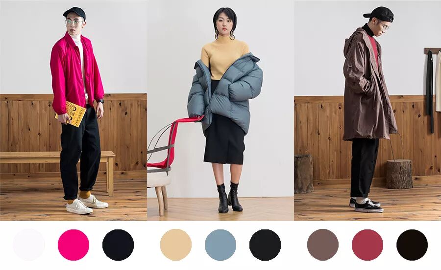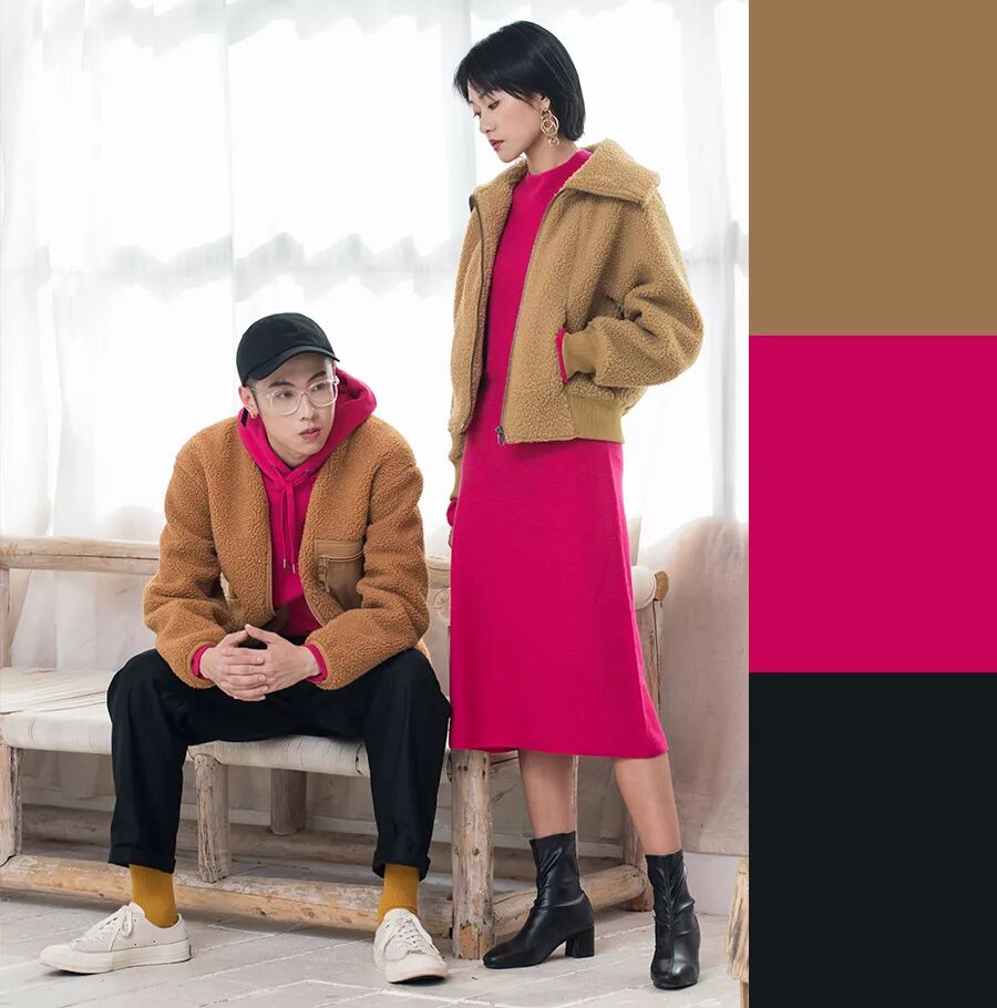 很多同学碰到像玫红这样醒目的色彩,往往会倾向于选择用黑白灰中性色来搭配,希望用中 性色平衡玫红,但反倒会起到衬托玫红的作用,让玫红色显得格外跳脱,建议选择偏暗色的彩色来实现整体造型的平衡。