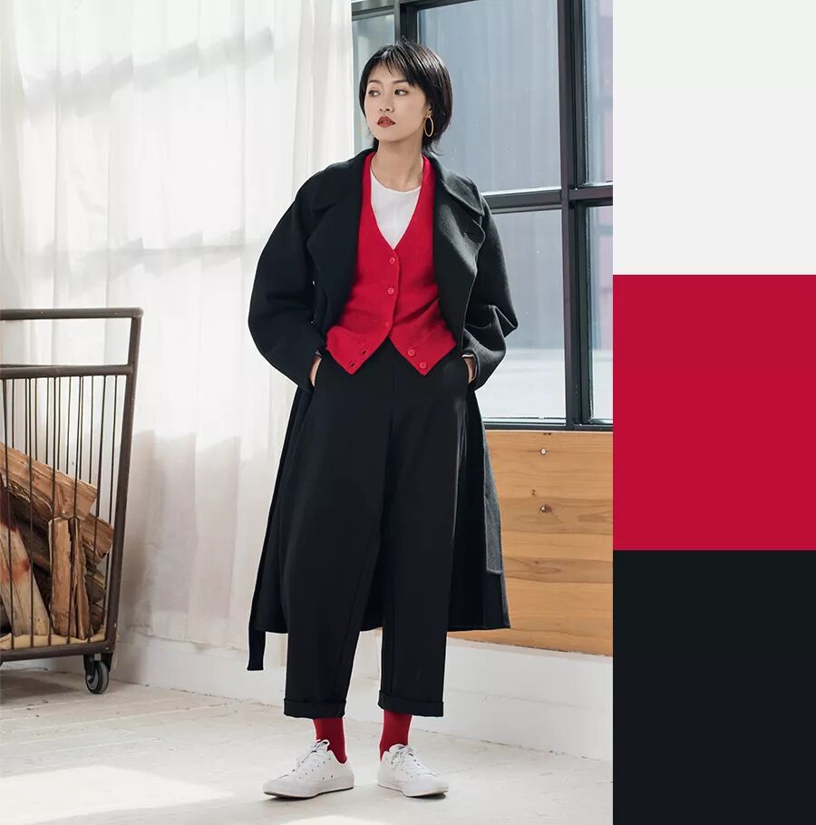 选择一款抢眼的红色单品作为主角,想要走安全路线的同学可以搭配黑白灰中性色,高段位 选手可以试试搭配今年的流行色紫外光或者秋冬“黑马色”玫红。