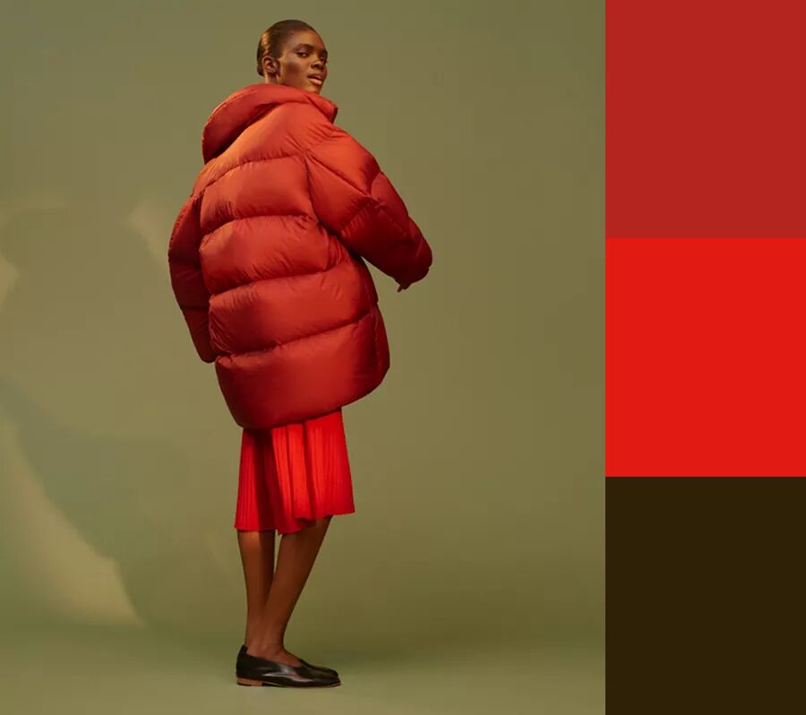 全身只穿一种颜色可能比想象中的更考验搭配。为了避免过于戏剧化的造型,搭配过程中需 要留心几个点。选择将不同材质的红色组合,或者选择不同色调的红色,可以使造型的视觉 外观更加丰富。比如像上图,以 Uniqlo U 系列 3D 精纺美利奴连衣裙搭配高级感的茧型羽绒服,组合了两种不同 风格的材质,同时 oversize 外套搭配修身连衣裙也很显瘦。