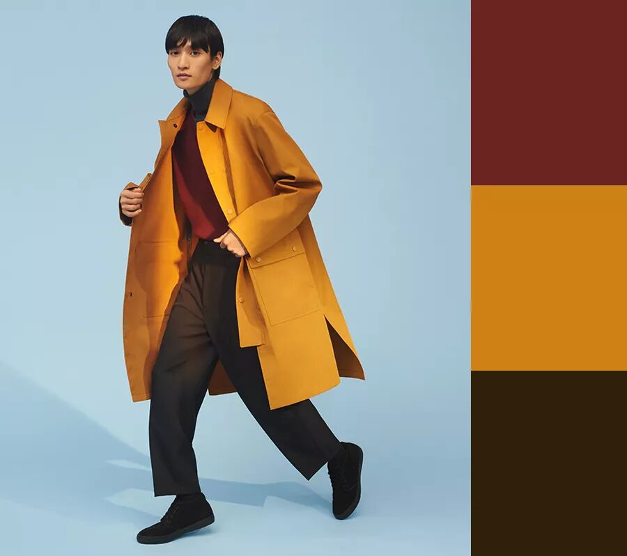 选择一款姜黄色单品作为主角,外套、大衣是首选,将其与深红色单品进行搭配很有秋冬氛 围。外套首先要推荐的是 U 系列的这款 BLOCKTECH 大衣,优衣库秋冬季的明星产品, 拥有出色的防风防水性能,U 系列本季为男女装都带来了 BLOCKTECH 外套,整体款 式也更加高级,装饰了扁平的大口袋,并采用后摆开合设计。女装的大衣还设计了可拆卸连 帽,并在功能上加入了吸汗排湿功能。