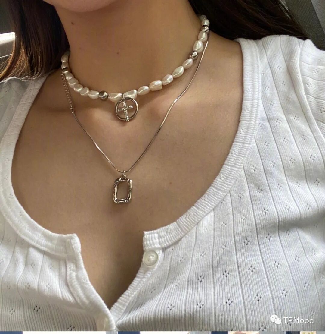 tips:珍珠项链叠搭佩戴会更显少女感。