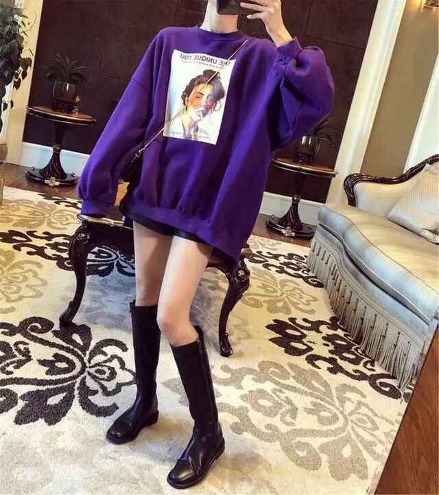 紫色的卫衣非常的吸睛,这么亮眼的颜色是非常的大胆的搭配。这种深紫色其实很显白,还是非常不错的,天气不冻的情况下,可以搭配短裤,那么鞋子就可以选择更加保暖类型的长靴,可以弥补短裤的缺点。4、卫衣+蛋糕裙