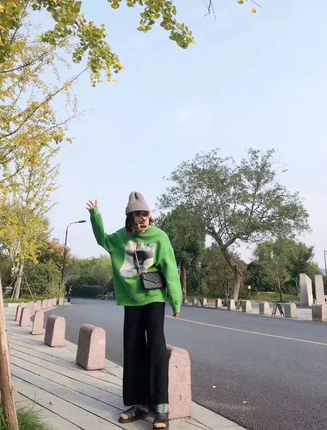 绿色是很特别的颜色,穿搭适当可以很想肤色。想不到卫衣还可以搭配阔腿裤吧,非常轻松的卫衣装扮。特别适合逛街的女孩子,轻松自在。6、卫衣+小脚裤