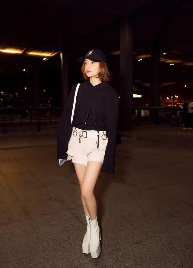 "下衣失踪"的穿法很适合夏天,在温差巨大的初夏用连帽卫衣来搭配短裤,搭配效果十分不错。袁姗姗选择将卫衣下摆都塞进裤腰里,这个尽可能优化身材比例的小技巧还能助力"下衣失踪"的效果,让双腿看起来更为纤长笔直,很适合20+女生日常出街穿搭了。