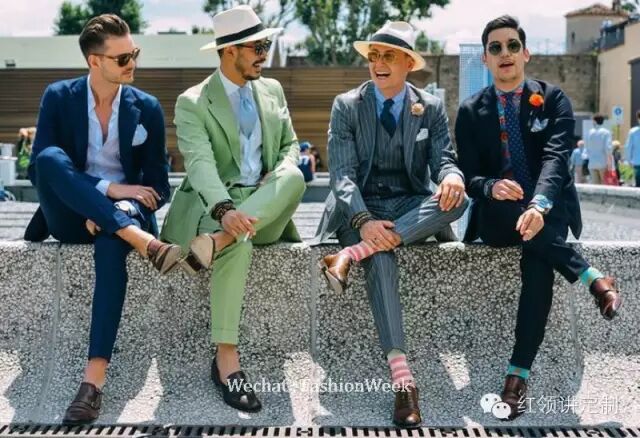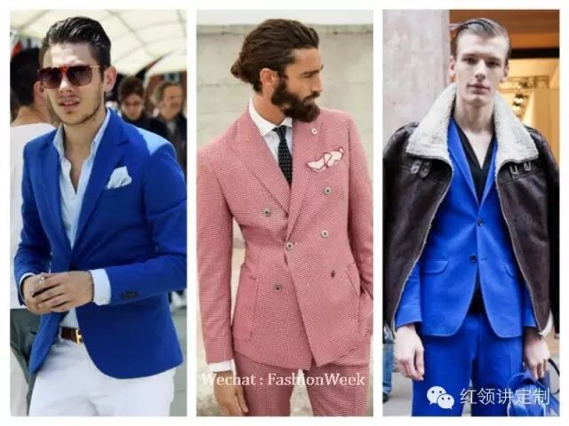 意大利男人非常敢用鲜艳饱和色彩,整套鲑鱼粉、湖水绿、海军蓝西装一点都不稀奇,对意大利人来说,大胆配色是男人有自信的象徵,但他们会用黑或白色衬衫来收敛。如果你天性比较低调,不想成为路人目光的焦点,也可以自小地方做起,从领带、皮带、口袋巾和鞋子下手,顺便训练花俏配色的胆量!