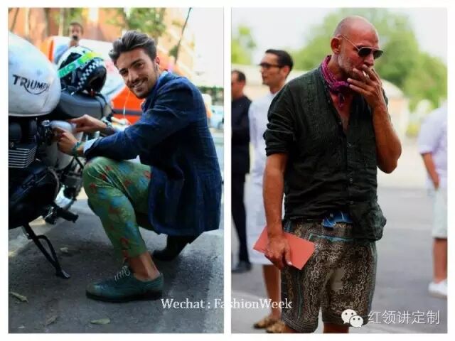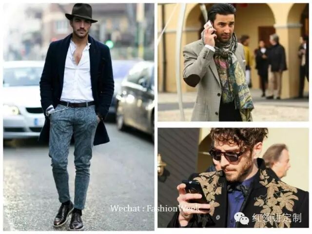 欧洲宫廷风和Paisley (变形虫)图腾,是经常出现在意大利街头穿搭的图腾,多用在口袋巾、领带、围巾上,做为穿搭的点缀,营造出欧式古典沉稳、严谨的气质。不过天性喜爱华丽路线的意大利人,有时也会穿上印满欧式复古图腾的衣服,但其他单品的选配就以素色为主,才不会抢走华丽图腾的风采。