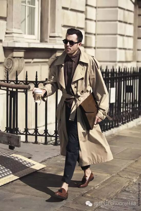 这种比较奇葩的穿法就不多说了,但是还是有借鉴之处的。反正编编个人觉得风衣最好还是敞开穿更有范儿。扣起来穿比较难hold得住,适合那些身材比较修长的男士搭配窄腿的裤子,如果是比较圆滚滚的男士建议还是别扣。