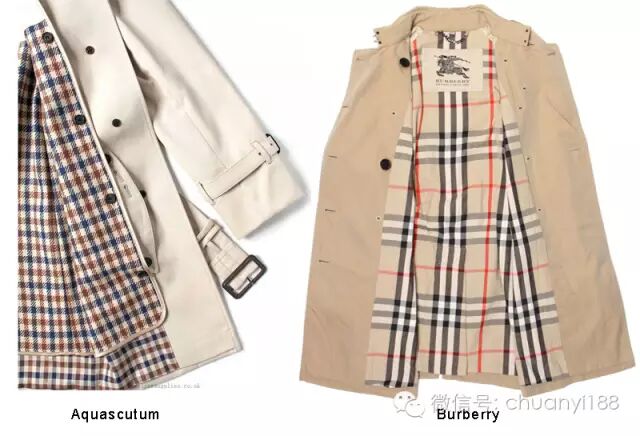 但很多时候大家会把它和另外一个品牌搞混。同样也是风衣,同样的格纹内衬,同样是英国品牌,Burberry是米色+红色+驼色的Burberry Check Nova,这个品牌则是杏色+蓝色+酒红的Aquascutum House Lable-club Check,如果你对英国品牌稍有了解,应该猜到了它就是Aquascutum。
