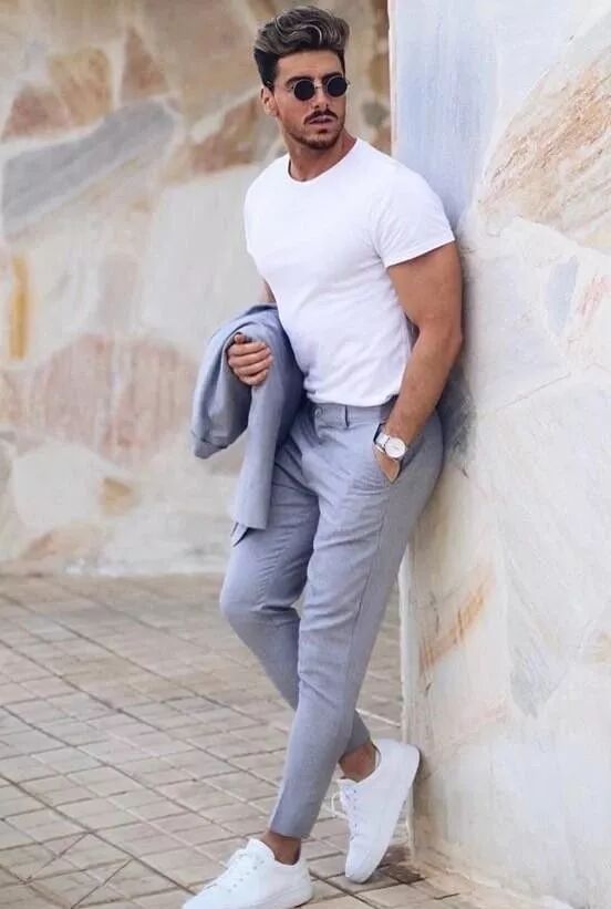 而对于灰白配而言,虽然也同样是安全的搭配,但是因为灰色本就有着“高级”之称,所以平凡中自然而然地会显露出一丝的时髦感!这个时候的美学效果不需要特别旺盛,只需要加入一点美学呼应的元素就可以了。比如小白鞋与白色T恤构成白夹灰的格式,就是完美!