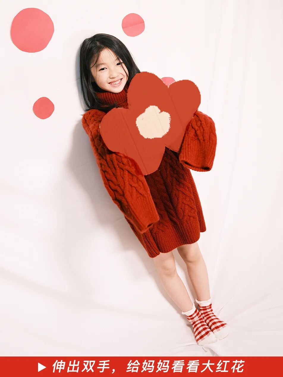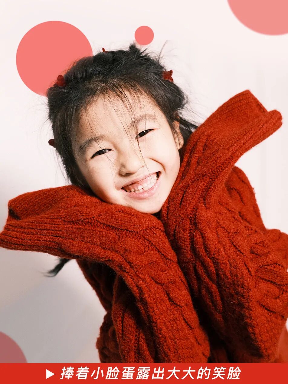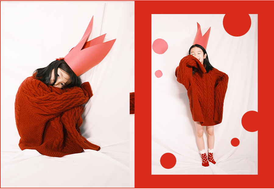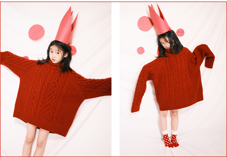 可以稍稍给娃捯饬一下。要是还没给娃买年服,直接穿大人的红毛衣也一样出彩。再搭配一双红色波点袜子,是酷飒随性的 oversize 风格。