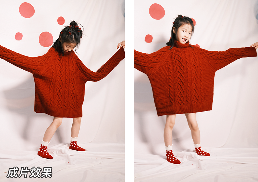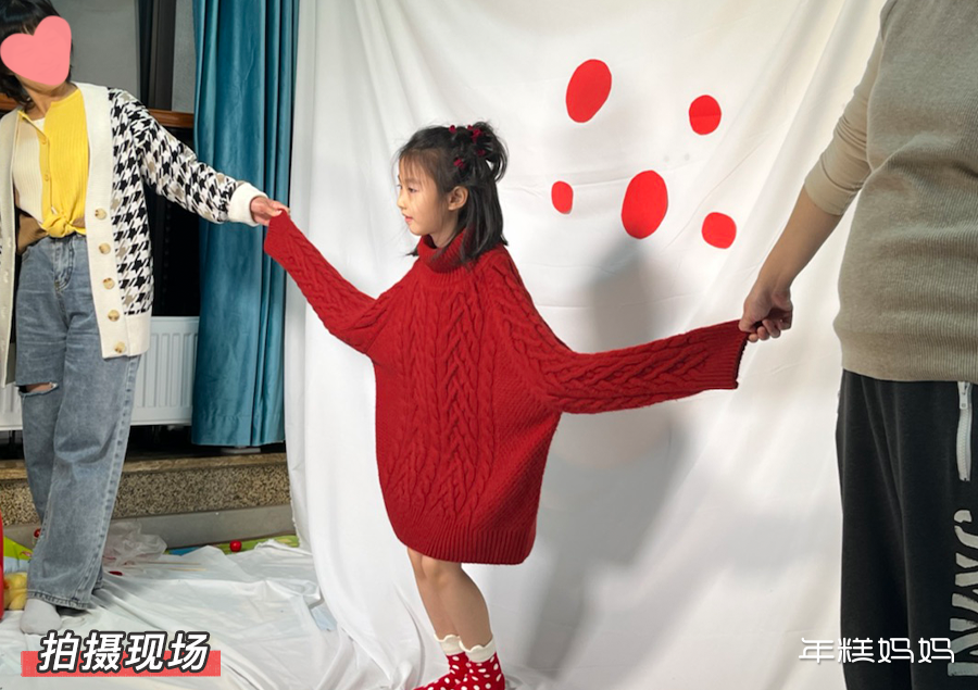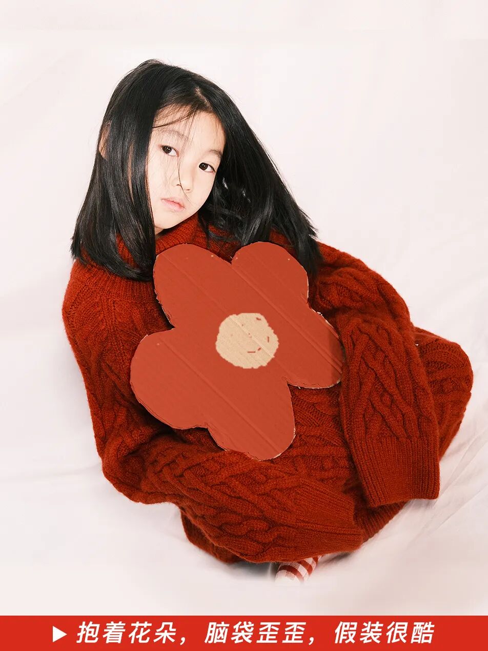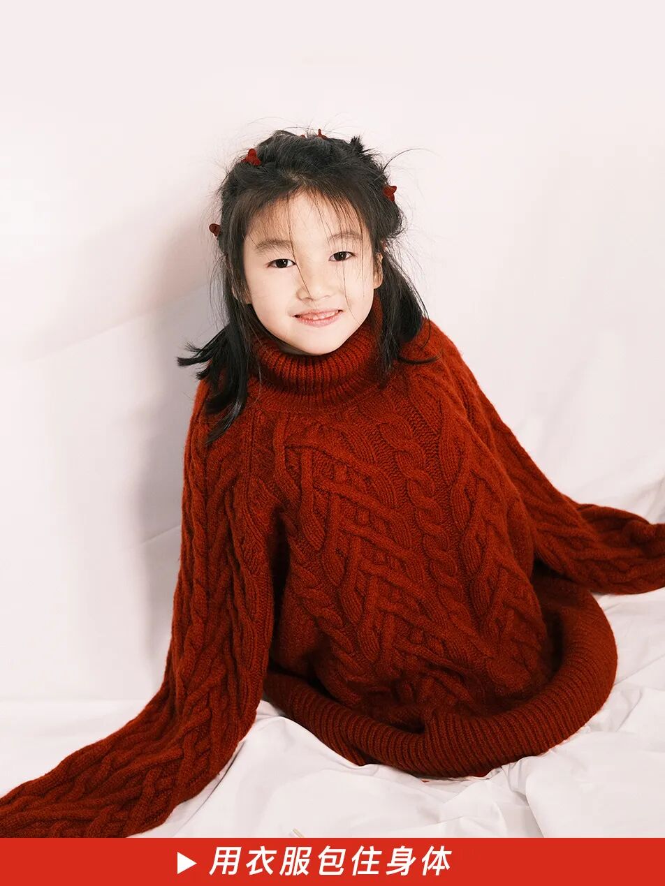 可以稍稍给娃捯饬一下。要是还没给娃买年服,直接穿大人的红毛衣也一样出彩。再搭配一双红色波点袜子,是酷飒随性的 oversize 风格。