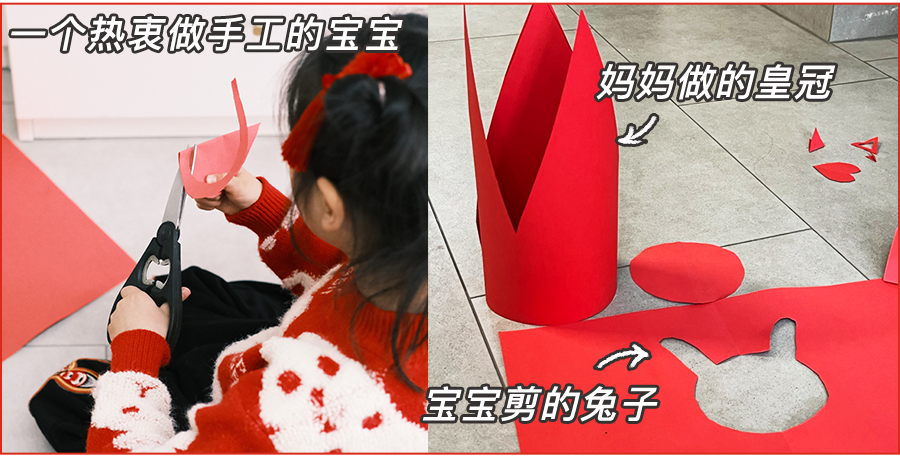 我们用红色卡纸做了王冠、镂空小兔子、还可以剪一些圆片片(贴在白墙上做装饰)。