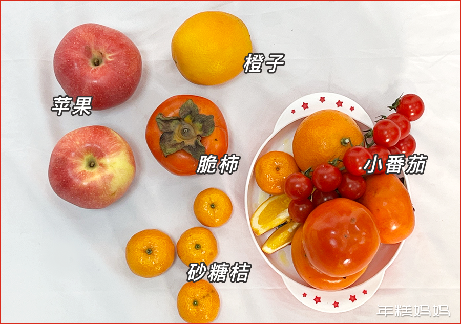 ▶家里正好有 2 个红色的凳子,上面放一些水果做前景,让娃伏在凳子上。