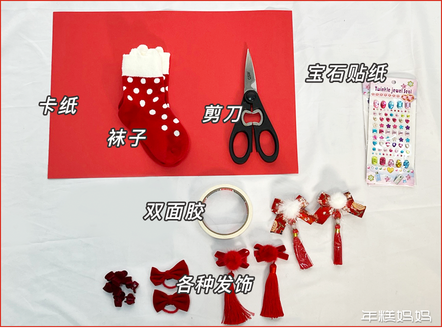 头发只需要简单披下来即可,也可以用红色发饰给娃做个小发型。