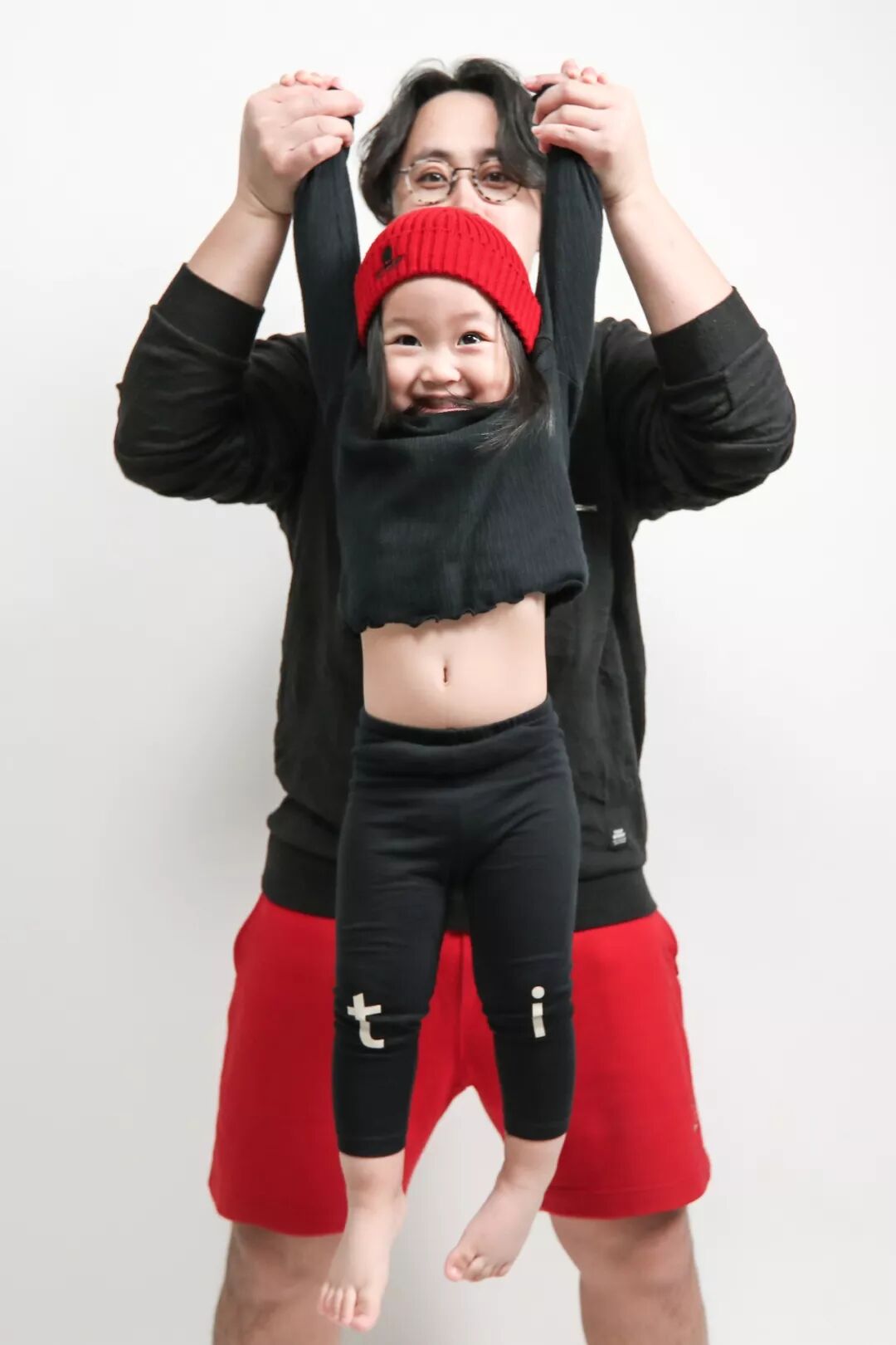 比如第一套亲子装,是一个红黑的搭配。但是爸爸妈妈和宝宝的色彩虽然运用是完全一样的。但是每个人都是有区别的配饰。宝宝是黑色套装加一顶红色的帽子,妈妈是红黑条纹的one piece,而爸爸则是黑上衣,红裤子的搭配。这样彼此呼应又能充分展现各自的个性。