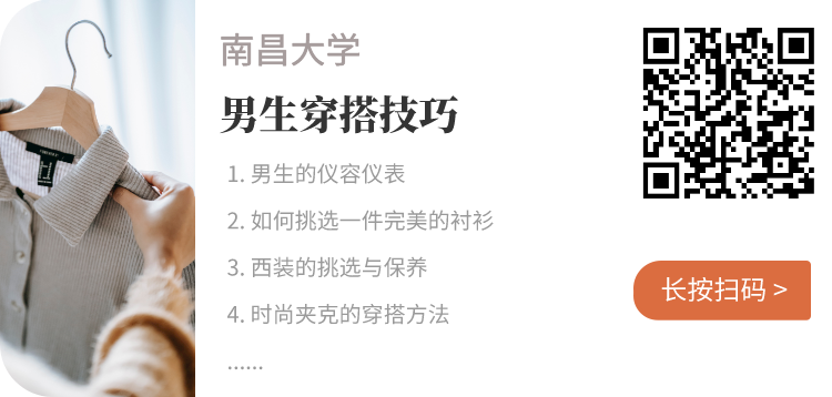 你没有看错,这门课就是男生穿搭技巧!爱美之心人皆有之,不分男女,好的衣品可以给人留下出色的第一印象。这门课将根据服装款式、色彩和体型等多方面讲授男生穿搭,助你大方自信地走出校园、迈入社会!