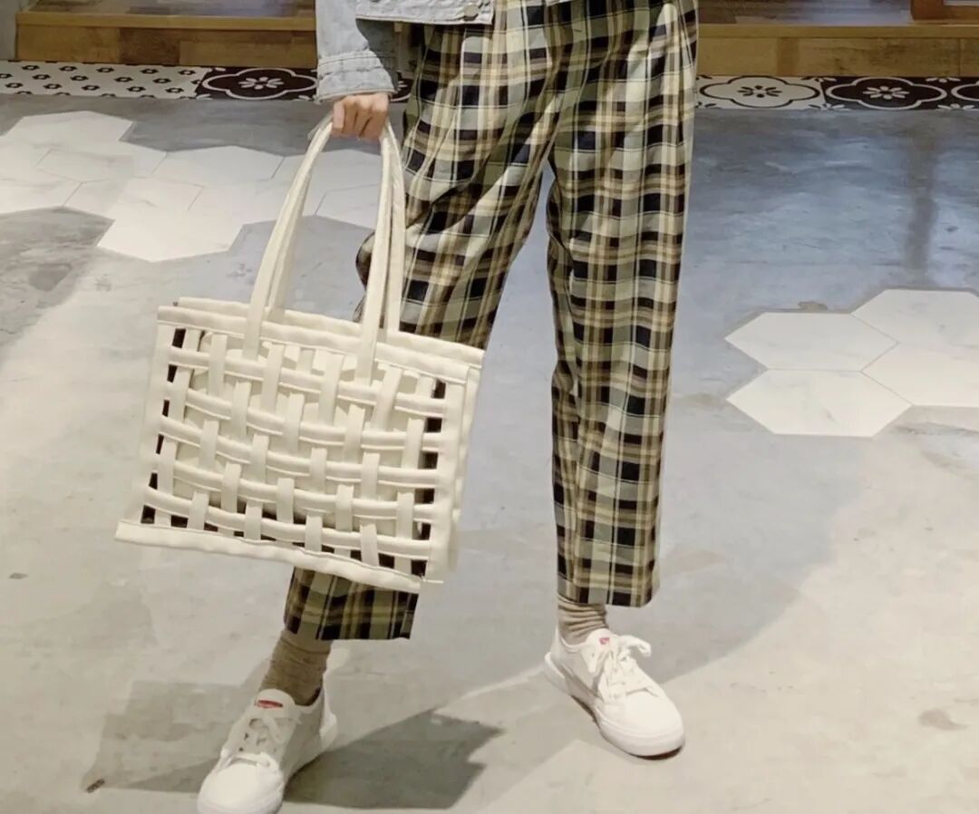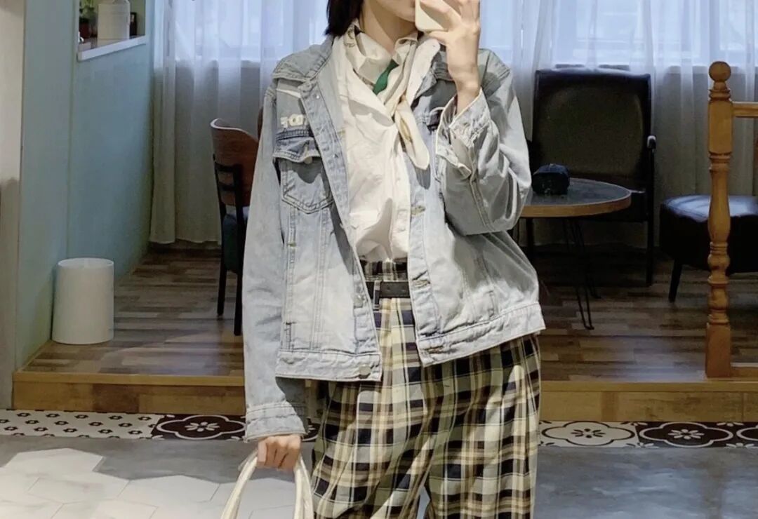 牛仔外套搭简单的白衬衫和格纹裤穿起来青春活力,丝巾随意一搭就能穿出时尚感。