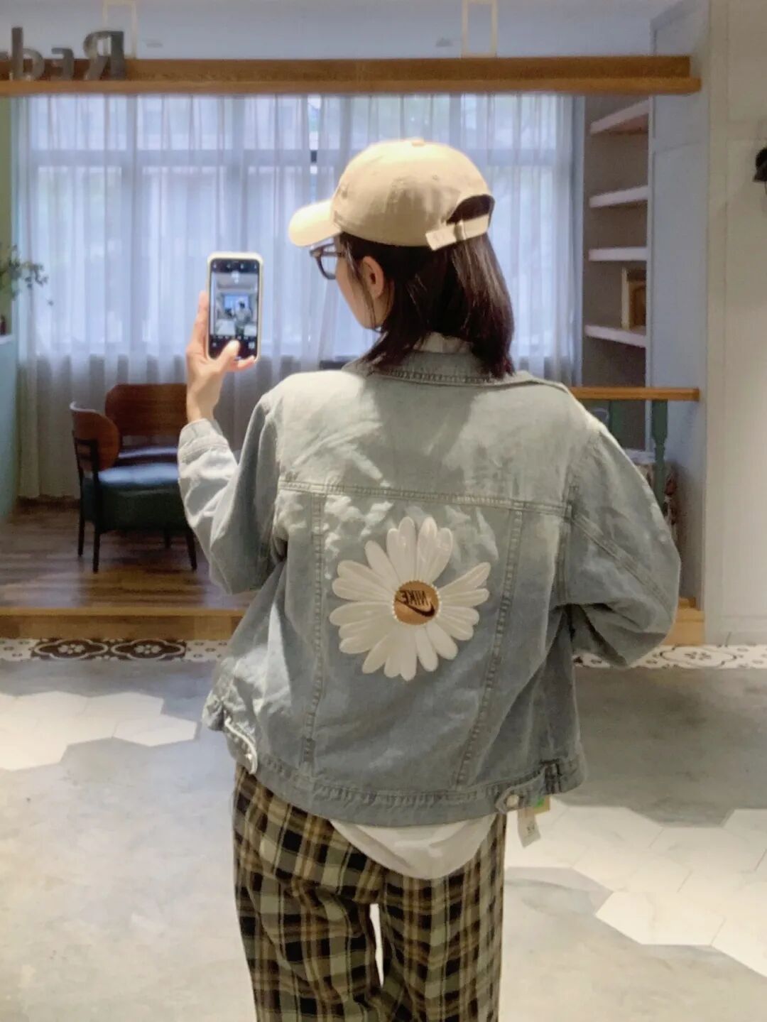 牛仔外套+白衬衫+格纹烟筒裤