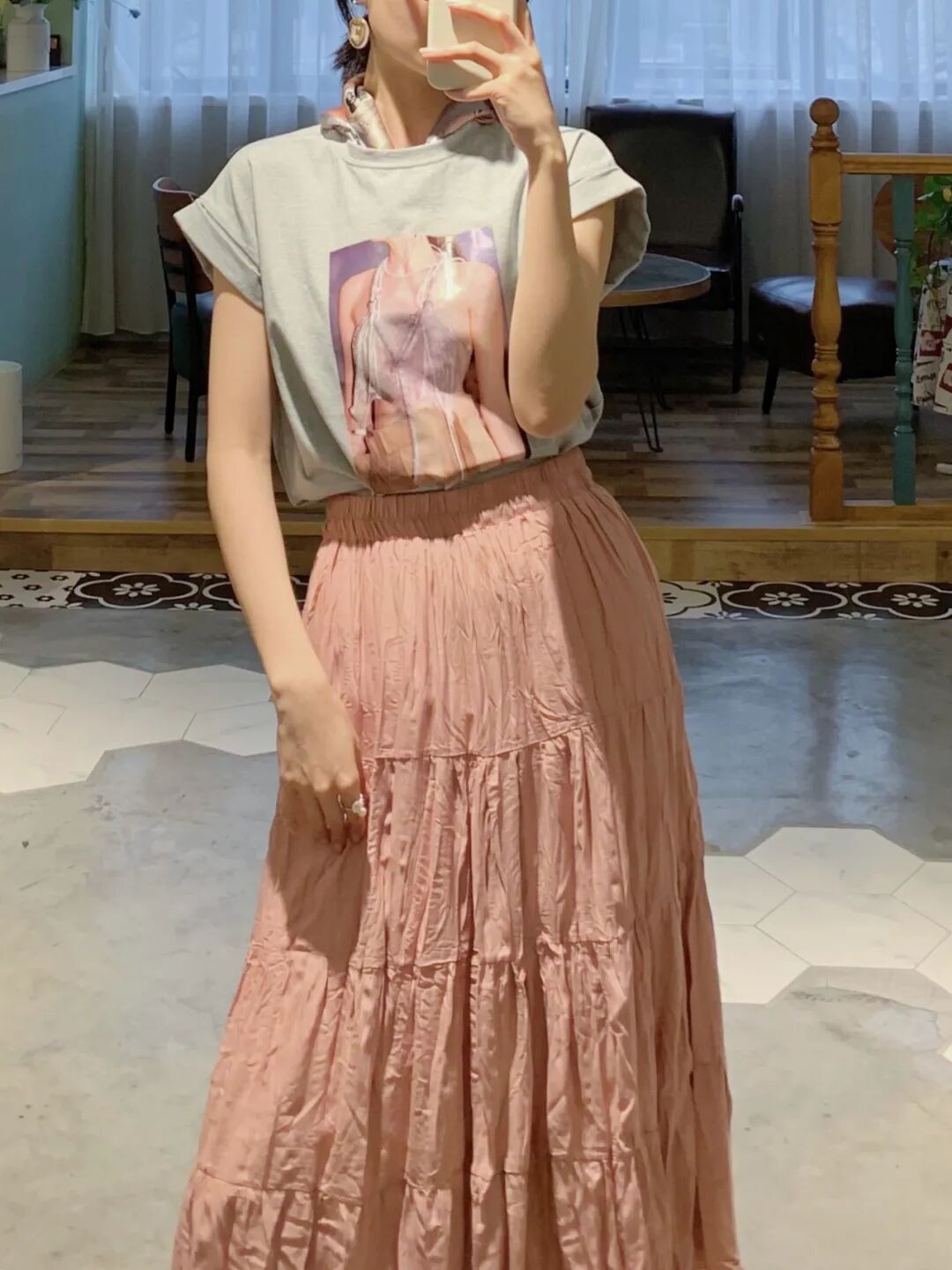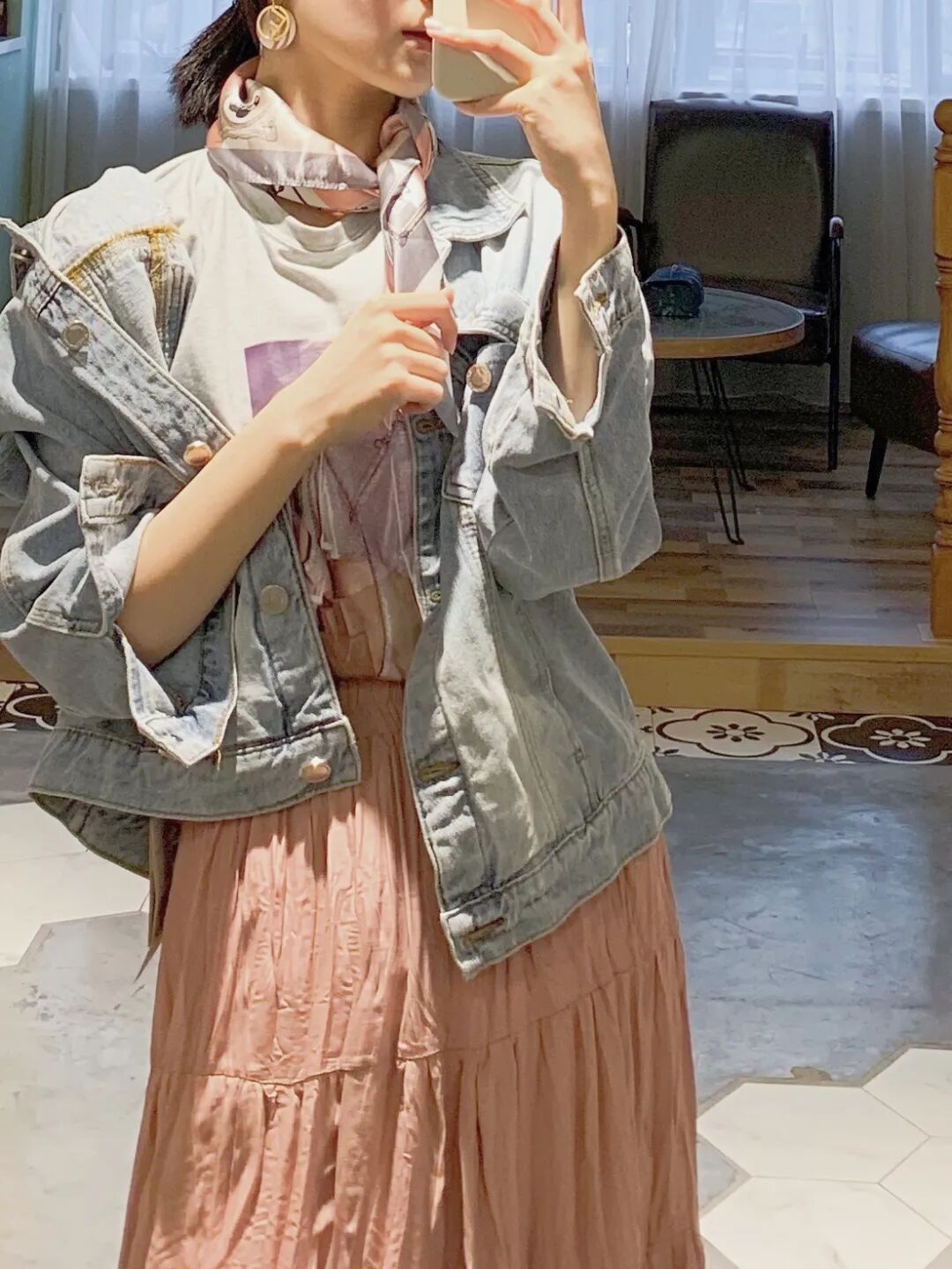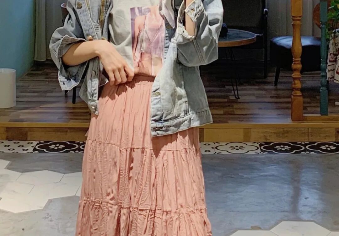 牛仔外套+粉色半裙+丝巾