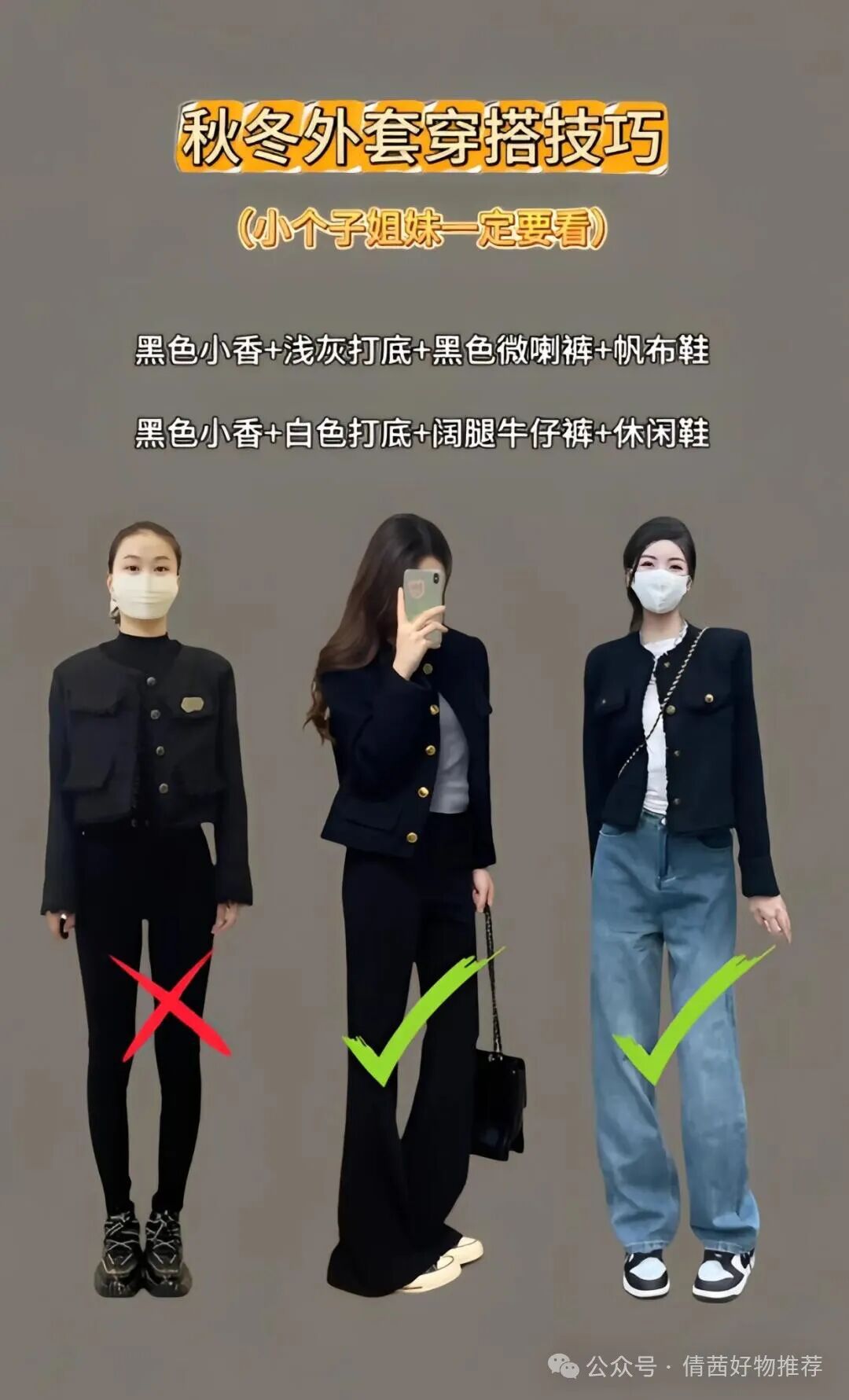 ?另外,颜色的搭配也很关键。冬天的外套颜色一般比较深沉,我们可以选择一些明亮的颜色来搭配,比如红色、黄色、蓝色等,这样可以增加整体的时尚感。第一套是黑色小香外套搭配浅灰色打底衫,再加上黑色微喇裤和帆布鞋?。