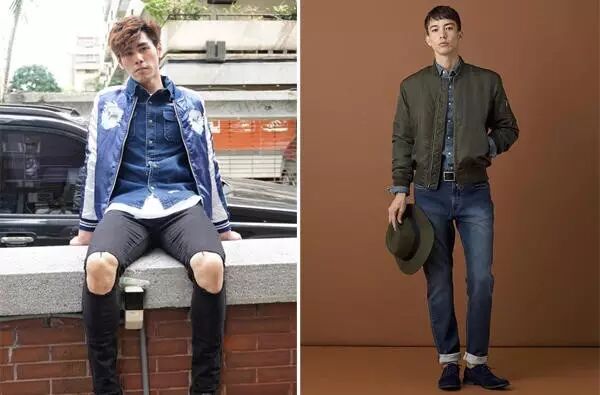 搭配巧思:右边型男毛衣里搭的是单宁衬衫。因为颜色、材质和外面的单宁外套不同。所以马上表现出两种单宁的层次感,大家快学起来吧!