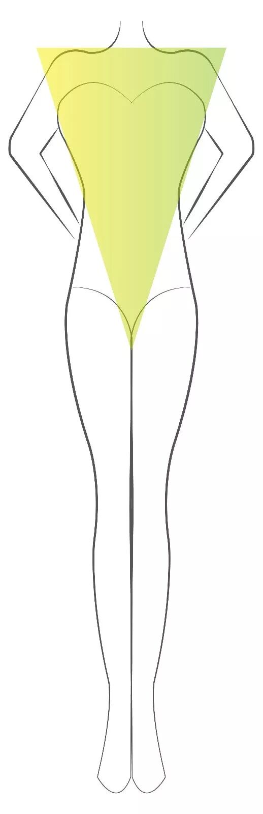 与正三角形相反,肩部宽胸部大显矮,臀部与大腿相形见瘦,有种沉重感。