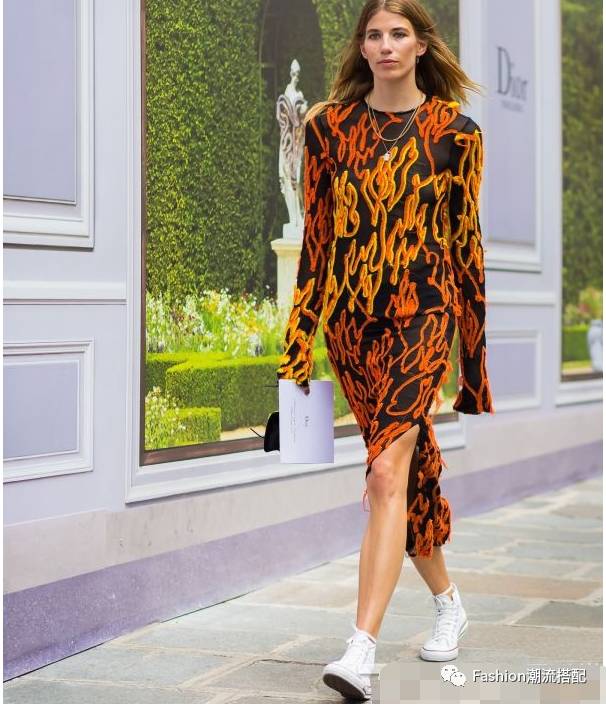 帆布鞋搭配连衣裙从来都是出镜率最高的,但是一条亮色的连衣裙或者独特印花的连衣裙才能助你脱颖而出哦。