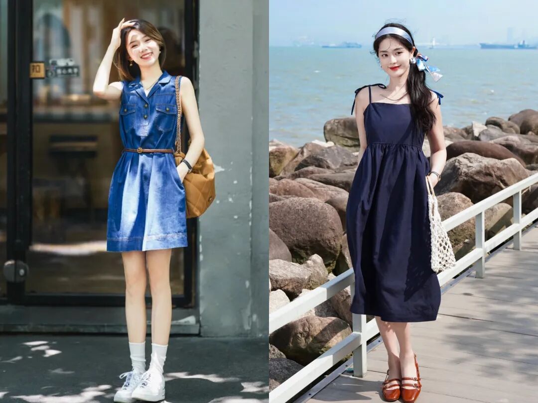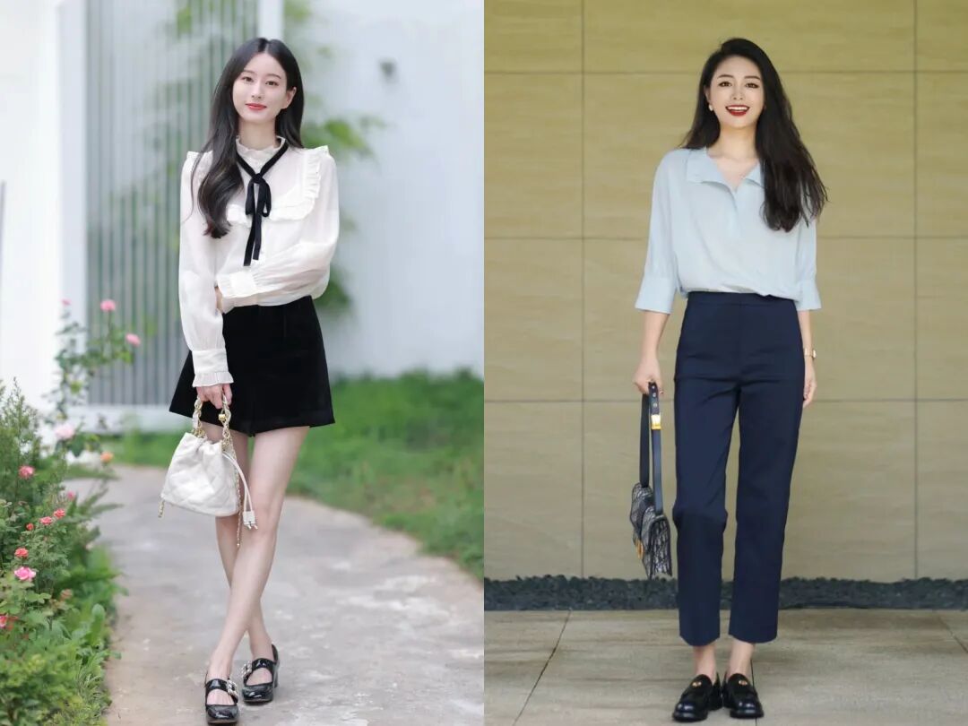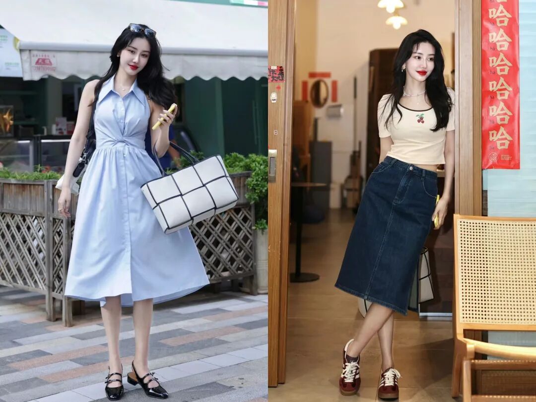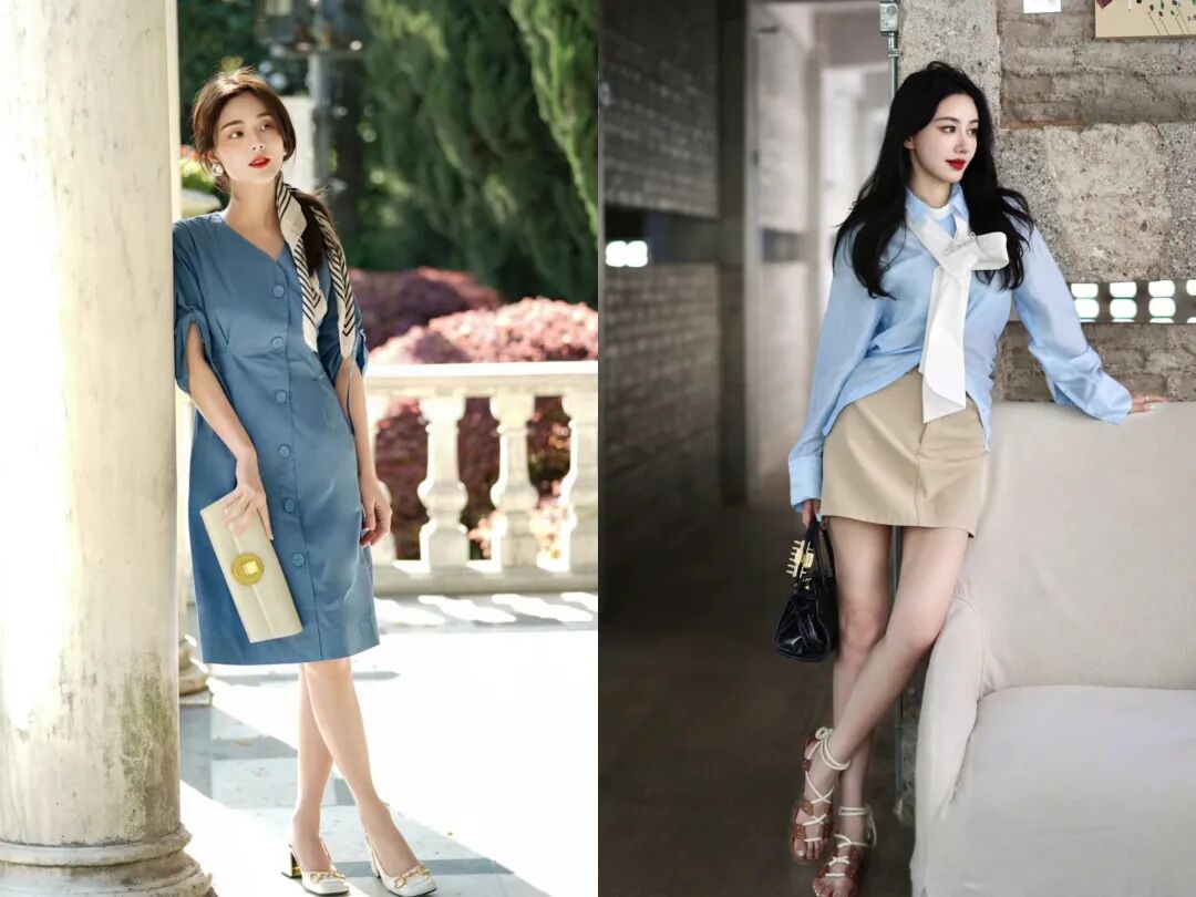 或者像上图右边这位姐妹,穿上一件清爽的蓝色衬衫,给人一种干净利落的感觉。搭配卡其色半身裙,展现出优雅与知性的气质。