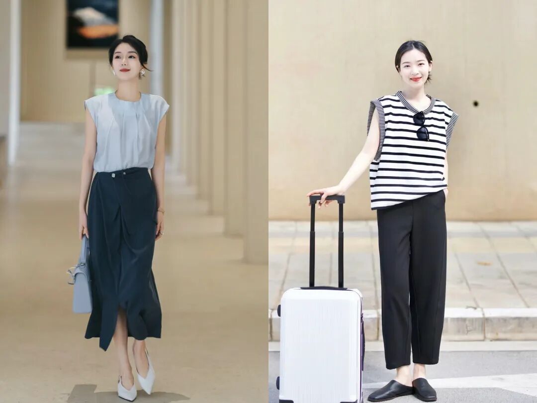 或者像上图右边这位姐妹,上身选择一件黑白条纹无袖背心, 下身一条黑色九分直筒裤搭配一双黑色穆勒半拖鞋。
