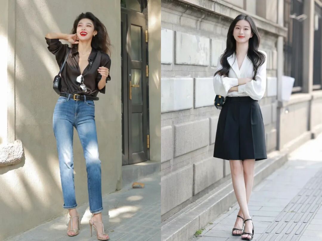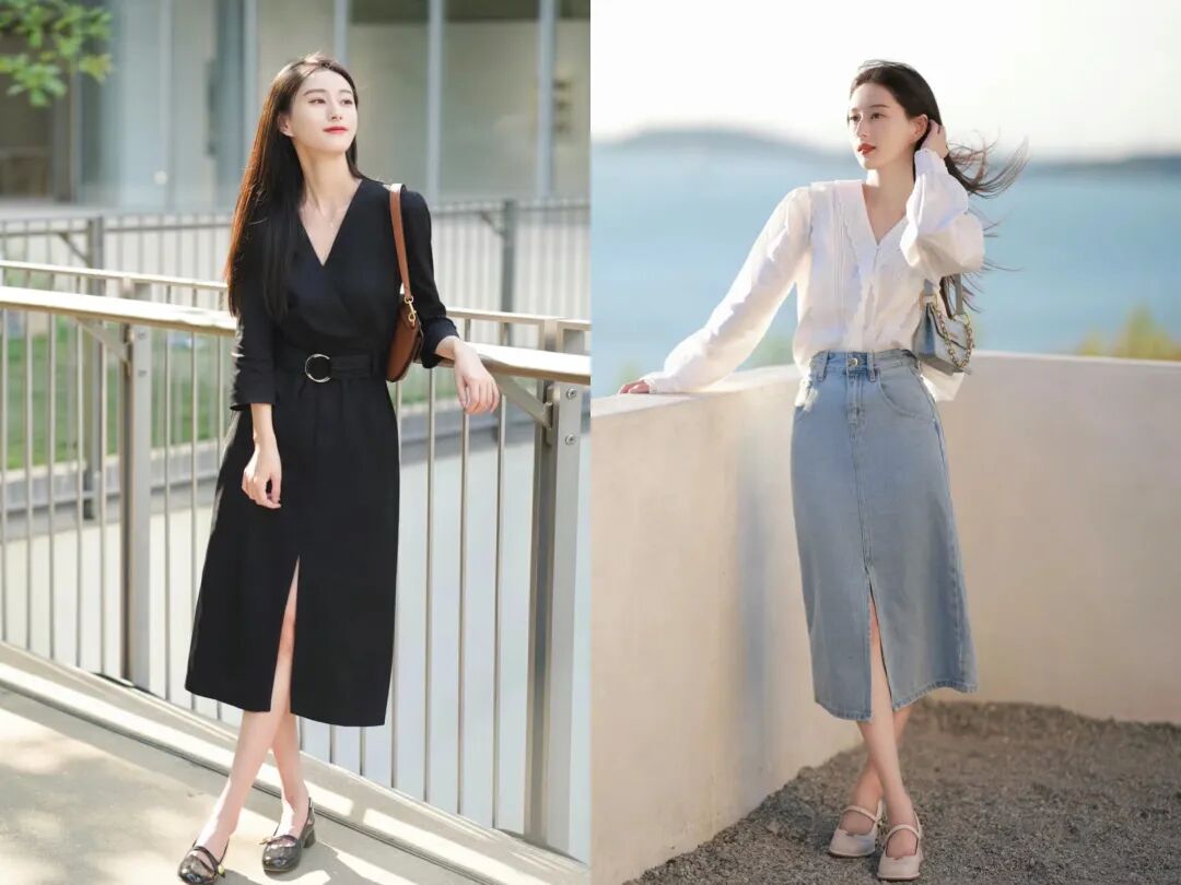 也可以像上图右边这位姐妹,选择一件简约的白色V领衬衫,搭配一条浅蓝色的高腰牛仔开叉半身裙。这身搭配既舒适又时尚。