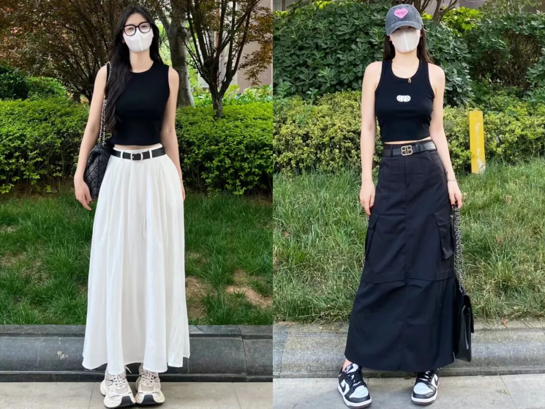 比如像上面左边这套穿搭,就很好地运用了这个技巧。黑色短款修身背心搭配白色半身长裙,再配上一双白色的运动球鞋,整体既休闲又显高。