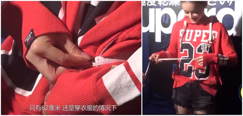 在参加线下活动时,袁姗姗现场测量腰围,搁着一层卫衣,腰围只有62cm。