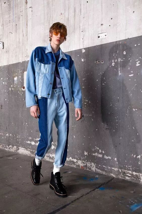 如果觉得大面积的纯色太过单调,可以尝试同色系拼色叠搭让造型更丰富。深浅不一的丹宁布料总是能组合出奇妙的效果,潮酷中又不失章法。