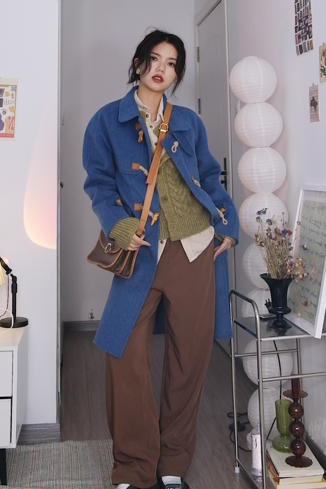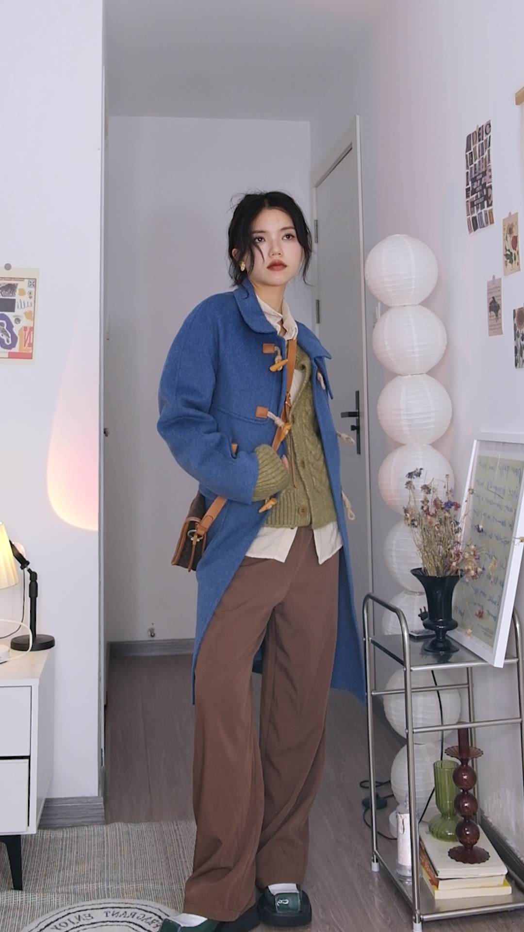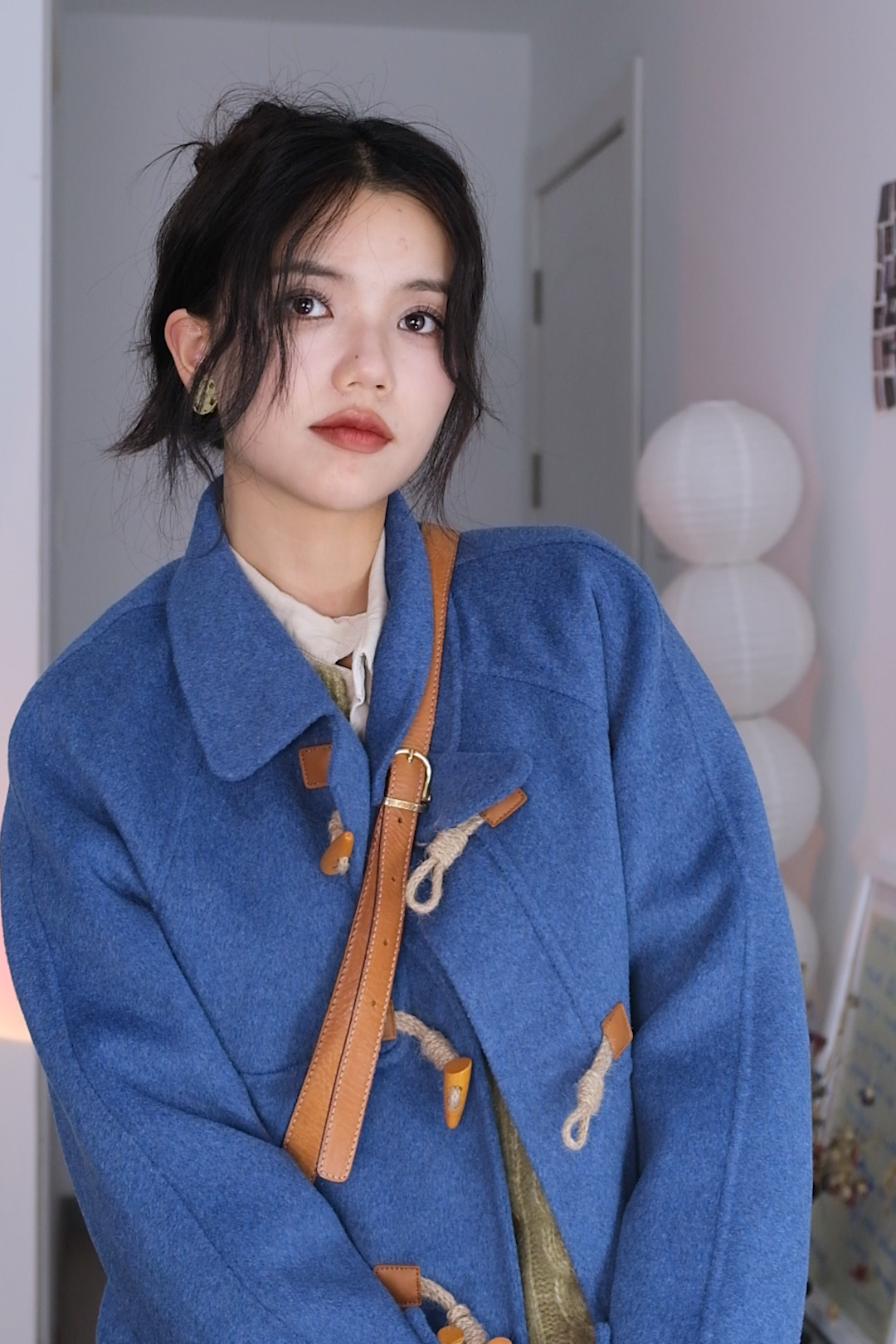 这个蓝不偏灰也不会太亮,搭上牛角扣就很有秋冬的氛围感。