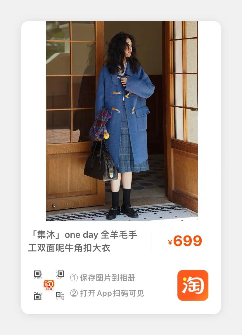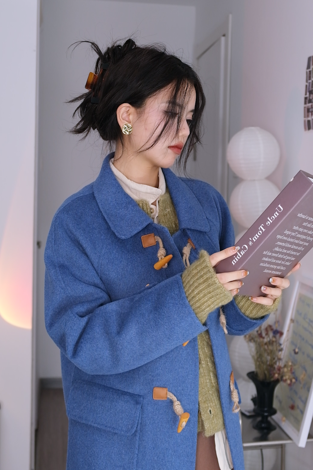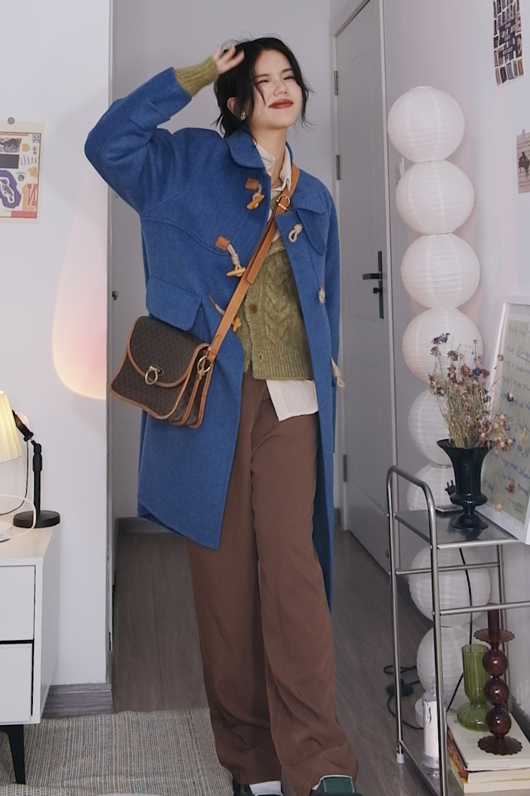 这个蓝不偏灰也不会太亮,搭上牛角扣就很有秋冬的氛围感。