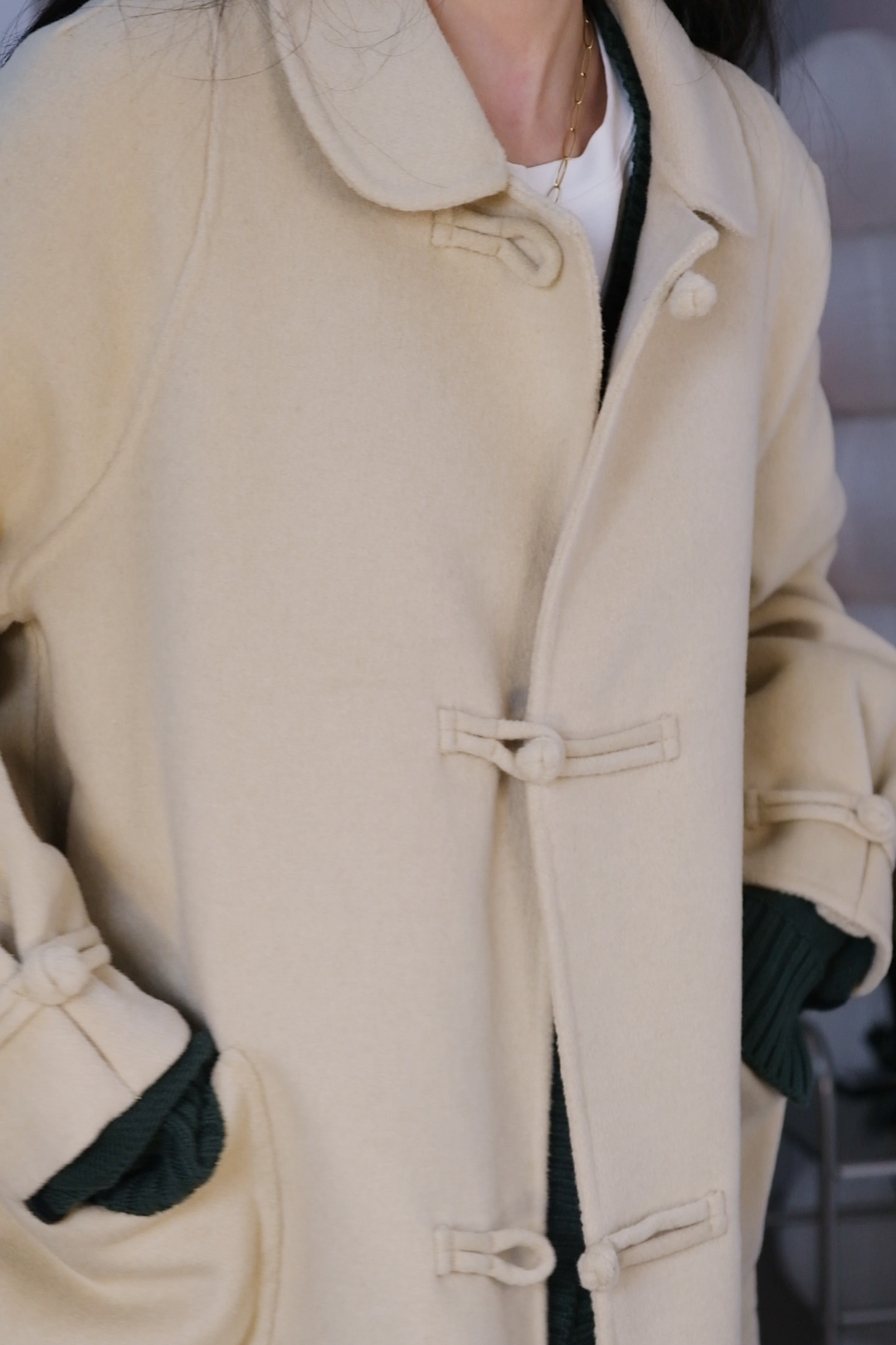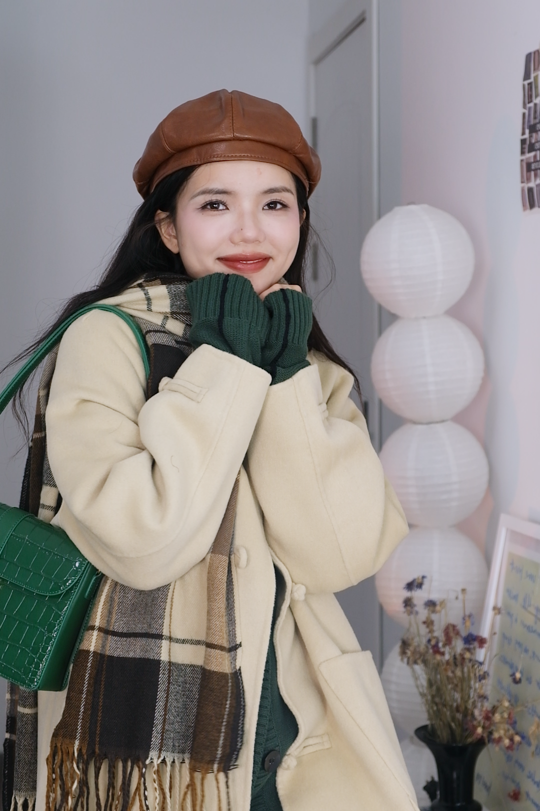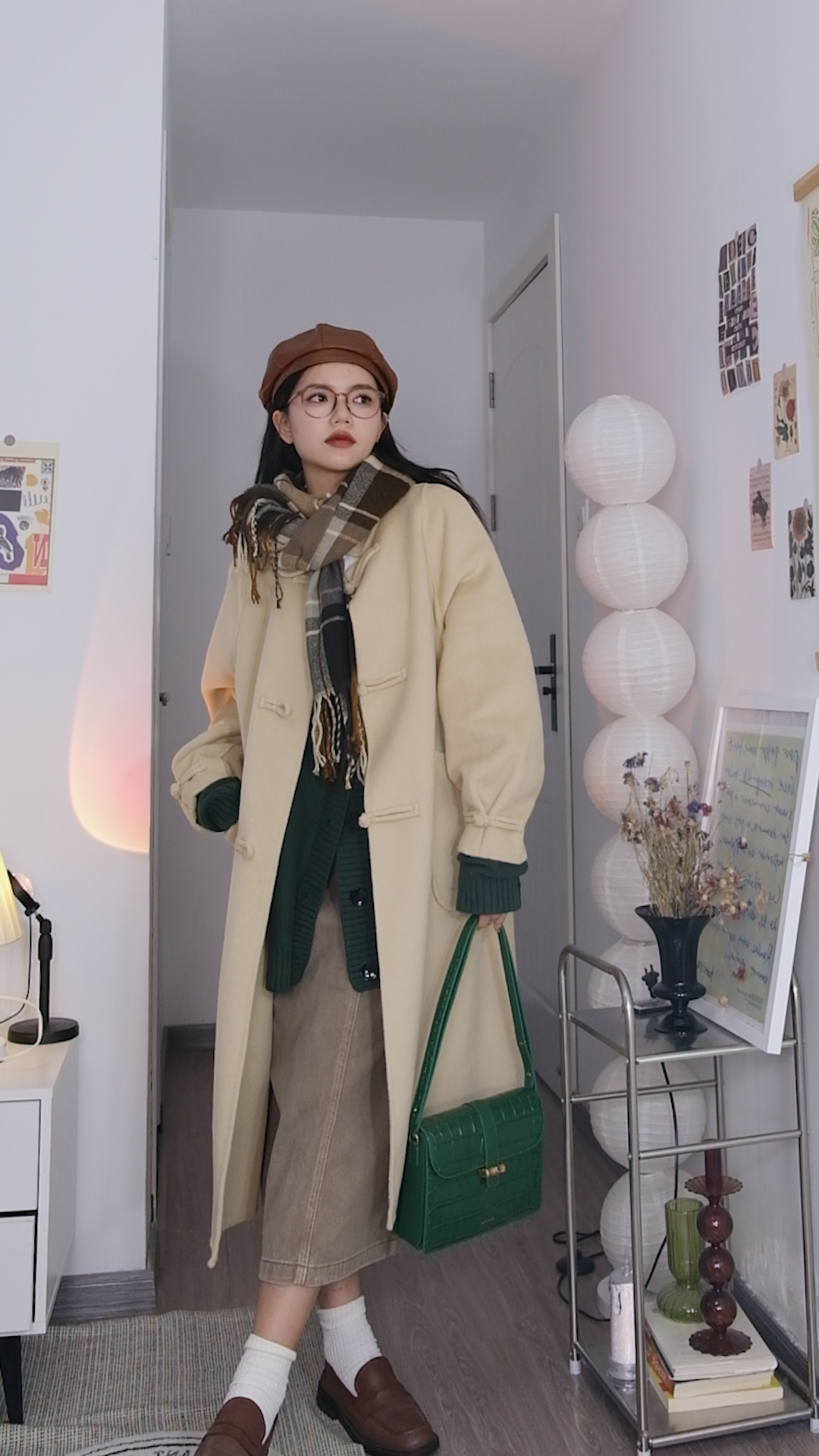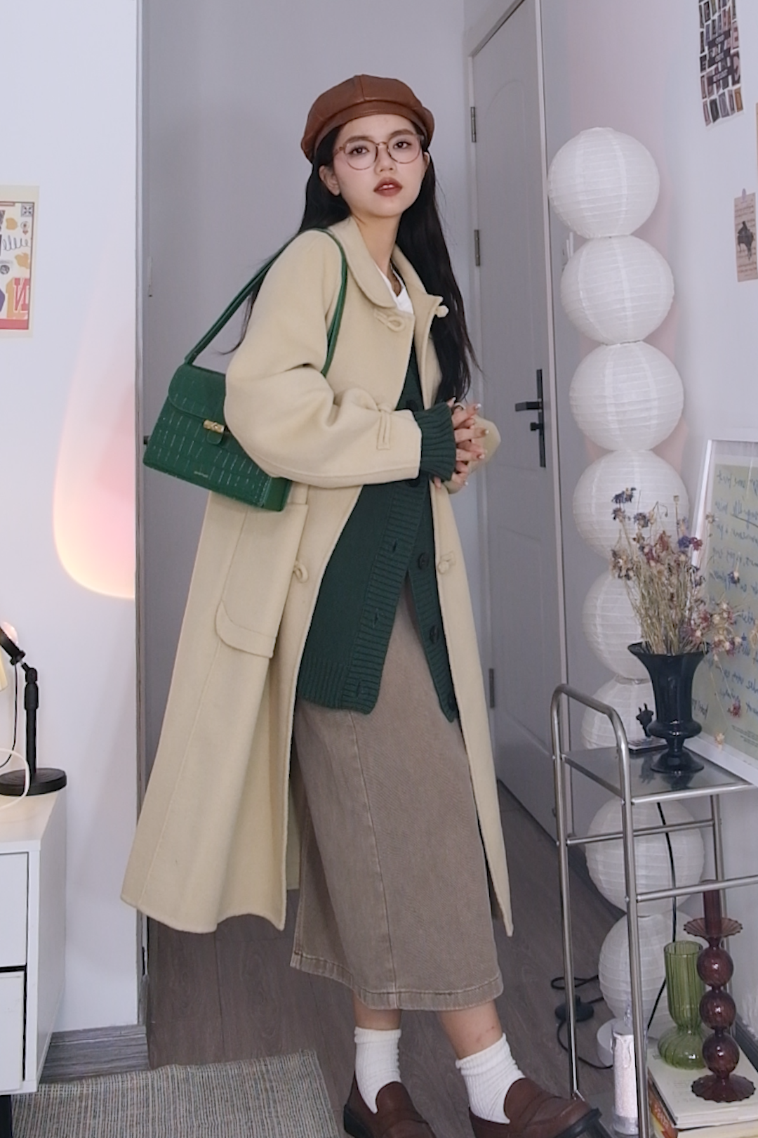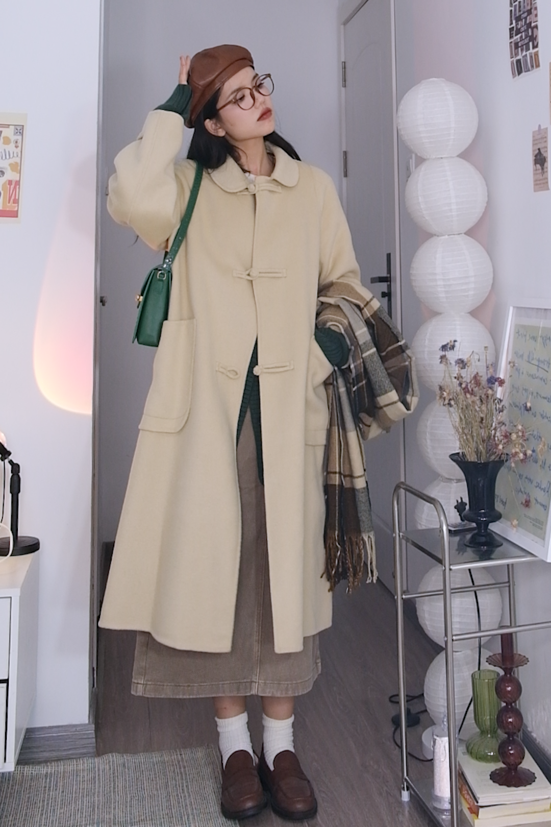 浅卡其的大衣还带有一点奶黄调,配上元宝领和牛角扣,看起来就特别乖。