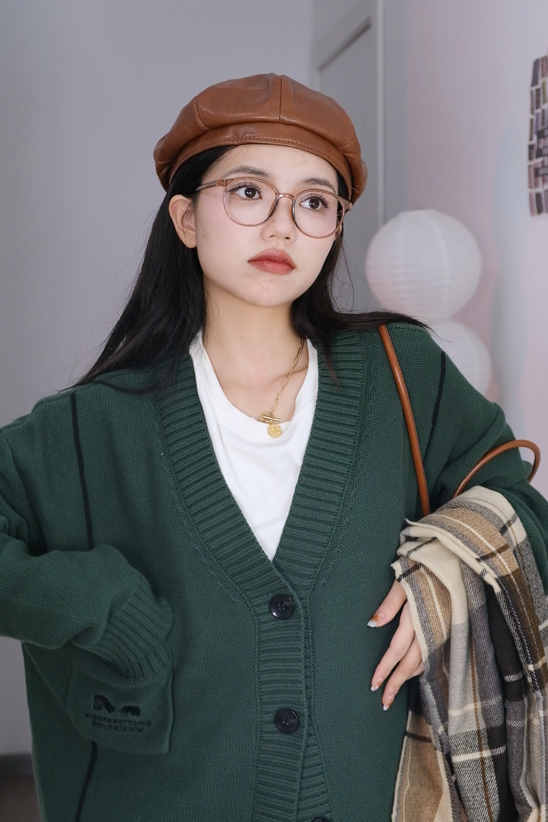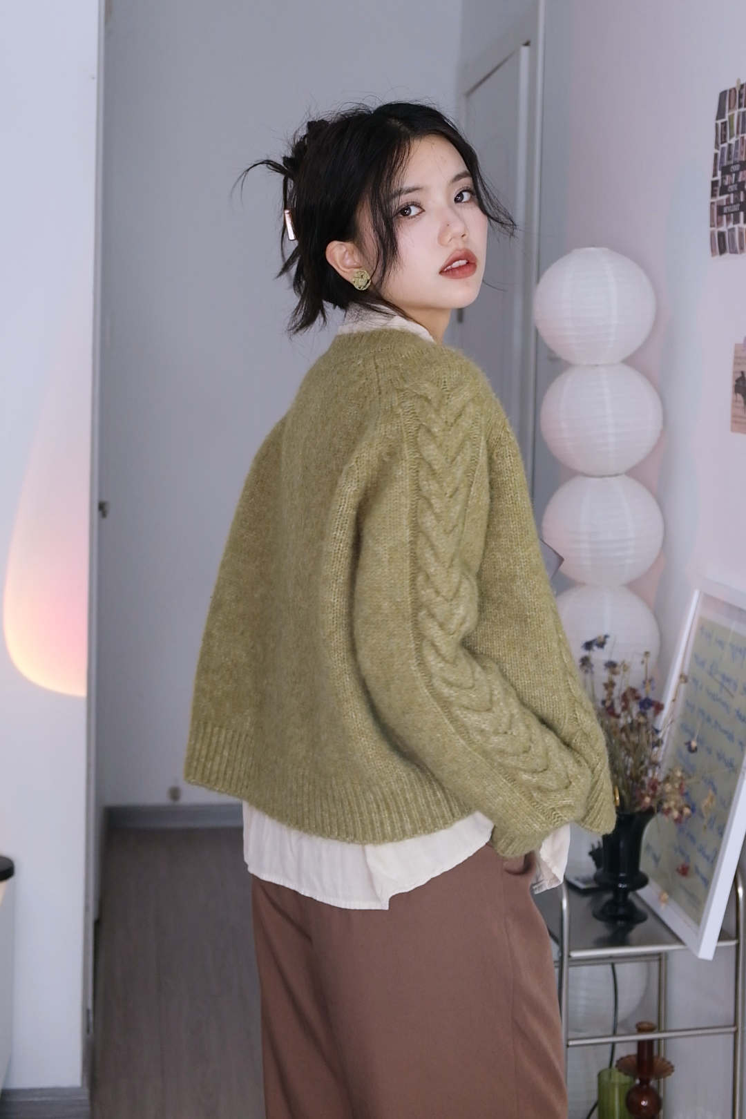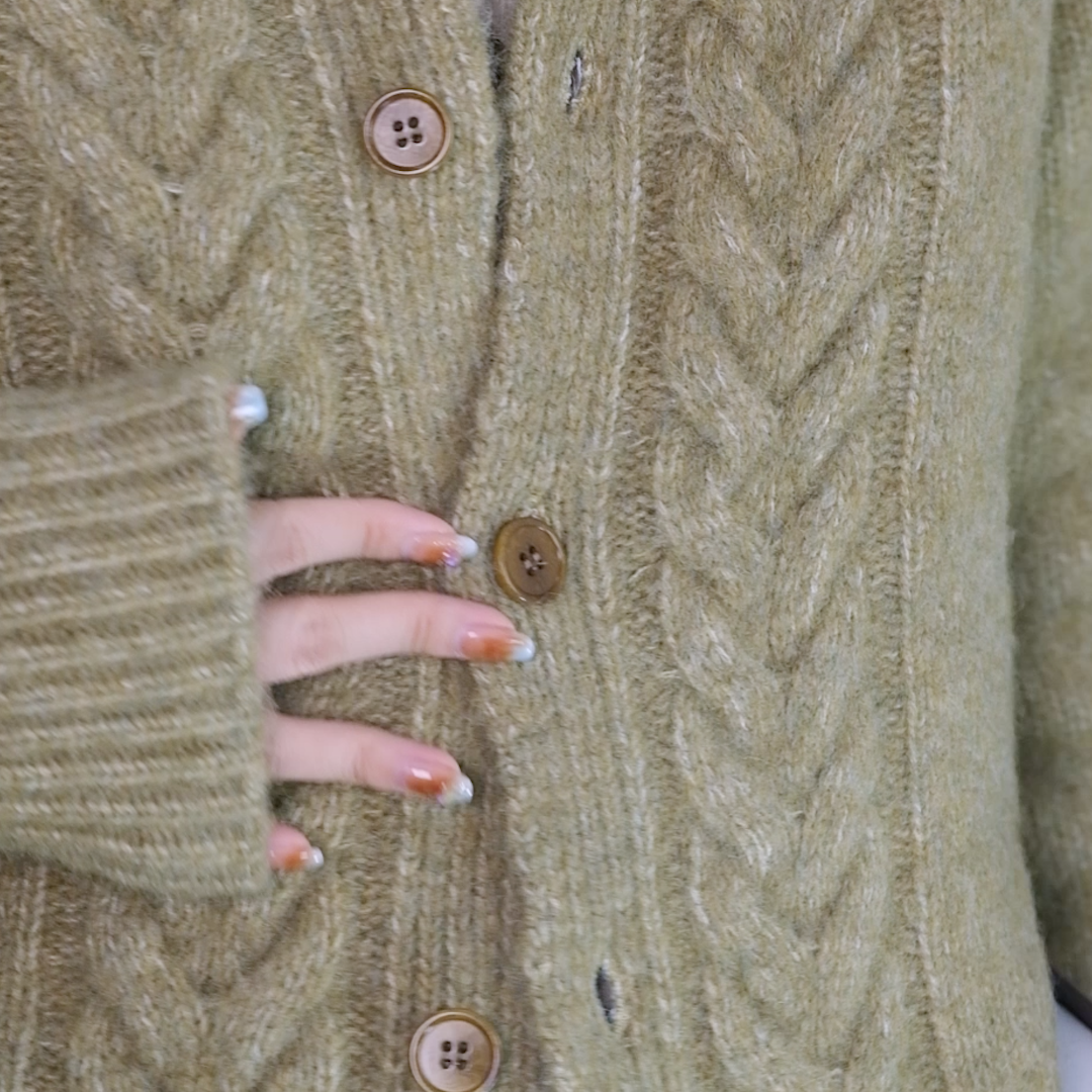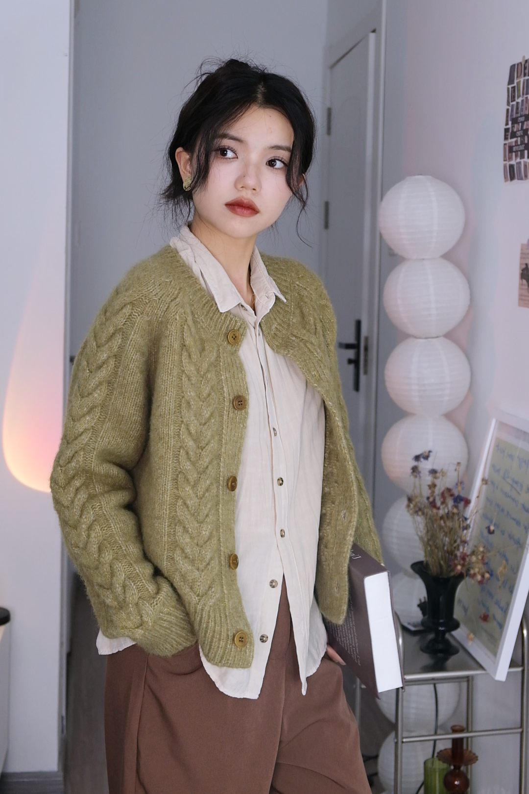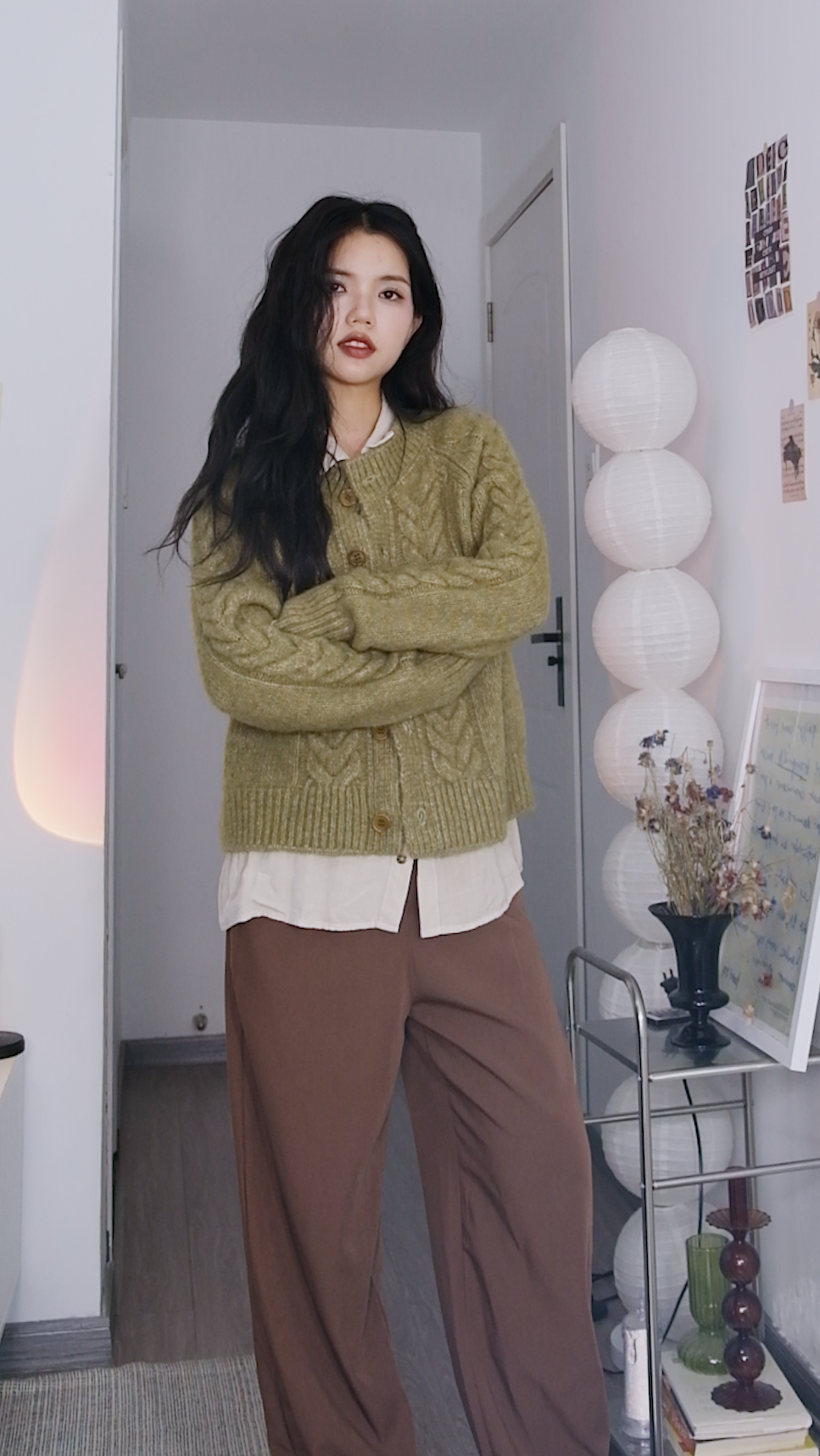 内搭是一件咸菜绿的毛衣,介于牛油果绿和偏黄的绿之间,凑近看夹杂了一点白色。