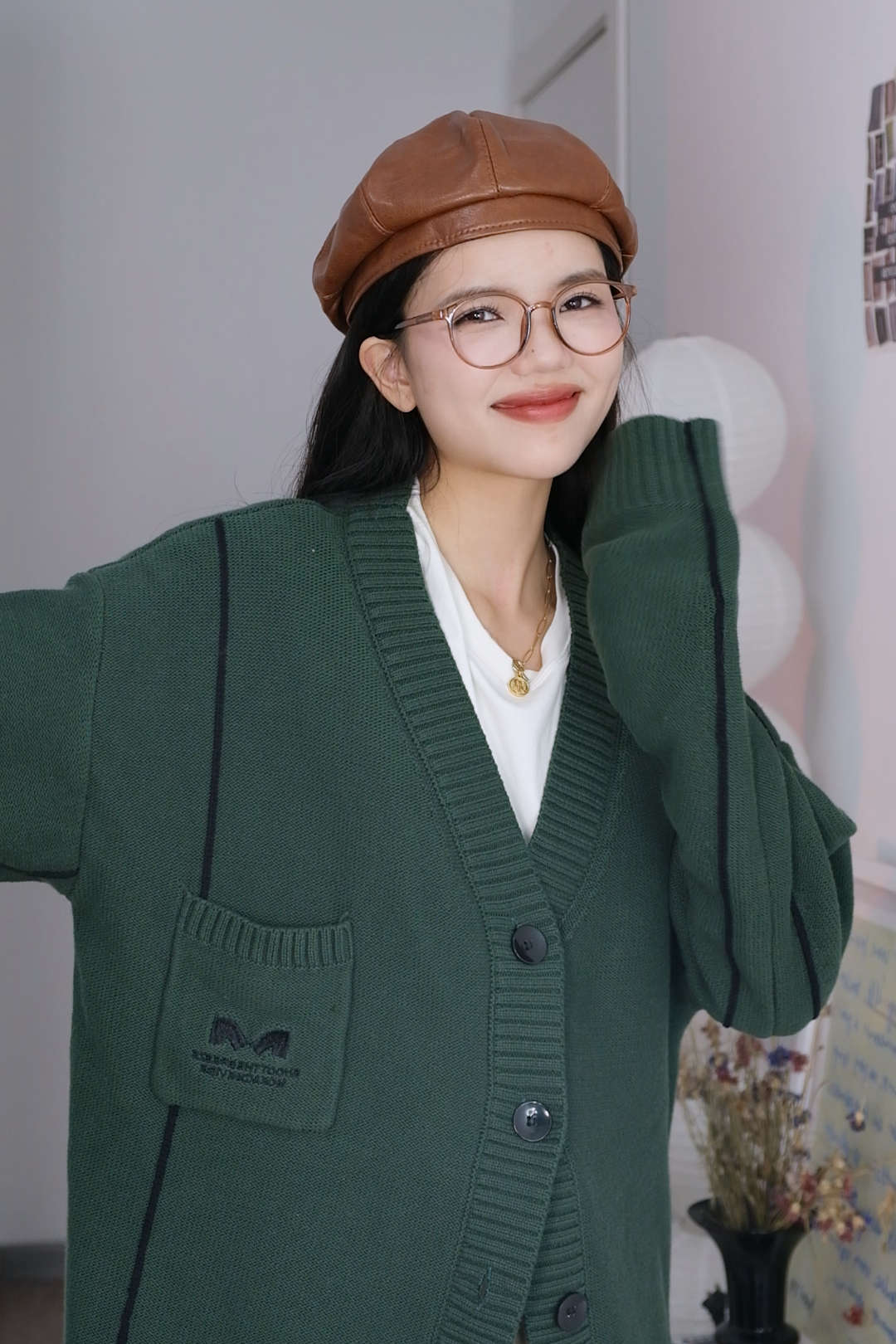 里面我做了一个墨绿的小撞色,选择了一件宽松版型的古着制服感毛衣。