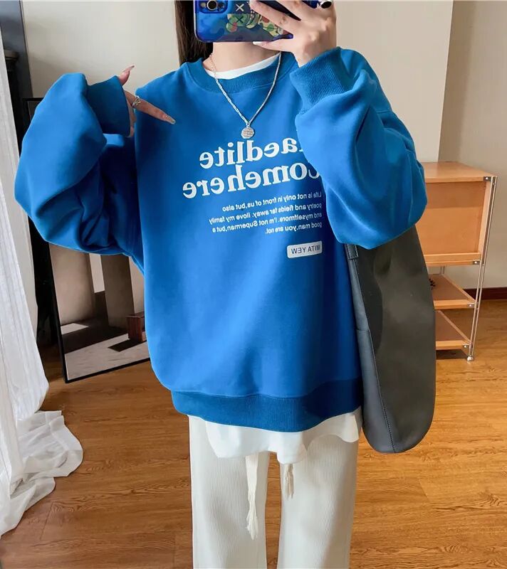 67¥ CZ3457 QhrFdXIzGO2¥ https://m.tb.cn/h.U7NvtPz WTHEONE减龄洋气字母印花银狐绒圆领克莱因蓝卫衣女加绒加厚冬季