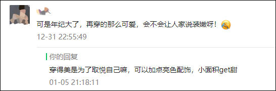 就像鸭梨之前写的甜妹那篇,有小仙女留言问:年纪大了,再穿的那么可爱,会不会让人家说装嫩呀!