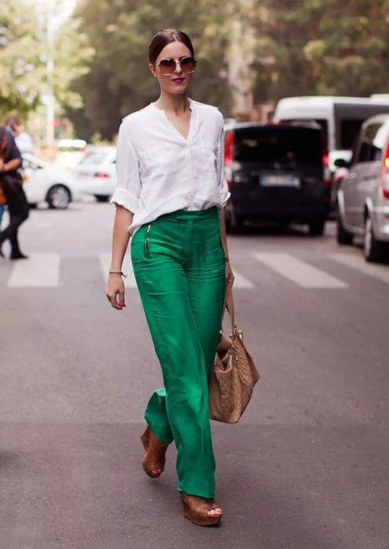 除了常见的颜色之外,绿色穿在身上也很有惊喜。绿色的直筒裤显腿长又显瘦,上面穿一件白色衬衣,高级又帅气,绝对时髦过同龄人。穿着在身上还会有一种独一无二的感觉,在你在同龄人中脱颖而出,瞬间吸引住所有人的视线。
