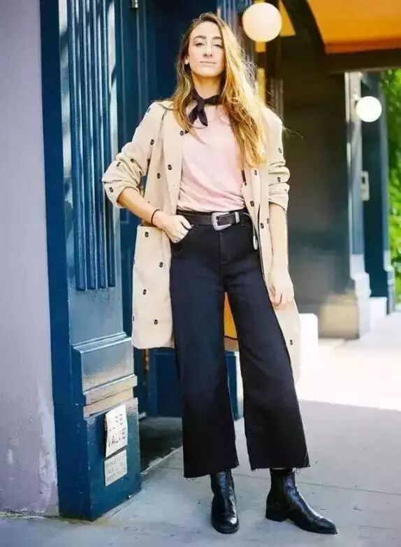 喇叭裤非常适合小腿粗的姑娘,而九分喇叭裤和短靴的搭配十分chic。▼