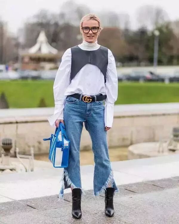 选上一条开衩的流苏裤脚的喇叭袖,非常有设计感,搭配着简单的靴子也很有看点。▼