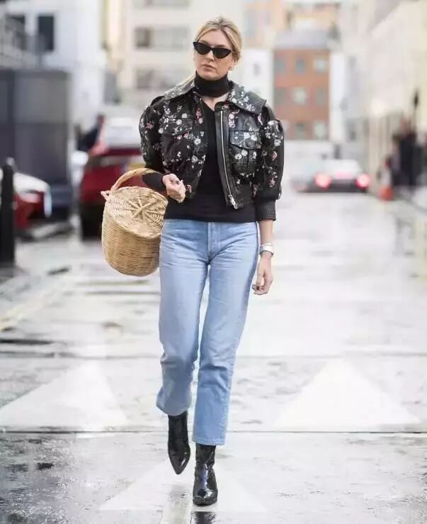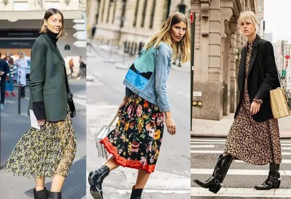 在秋冬季节,牛仔靴和印花元素的裙子特别般配。西装或者牛仔外套搭配印花裙,再搭配黑色的牛仔靴,可以平衡裙子的女人味,打造时髦又有个性的“娘man平衡”风穿搭。