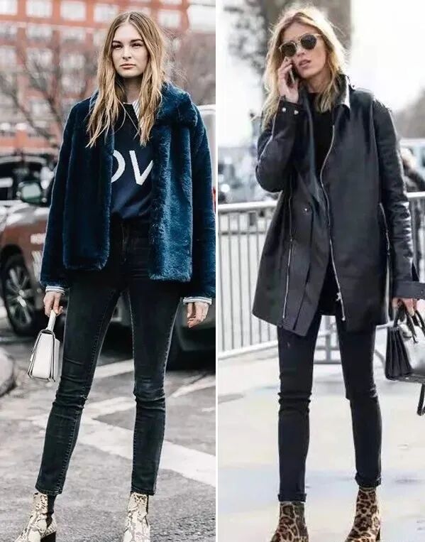 切尔西短靴除了经典的黑白棕,也推出了个性十足的“动物纹”款式。腿型好的女生,冬天可以选择修身的九分长小脚牛仔裤搭配宽松的大衣,会非常显瘦,靴子可以更有酷一点,比如搭配黑白的蛇皮纹、豹纹的切尔西短靴,看上去会更时髦有型,整体穿搭也更有亮点。