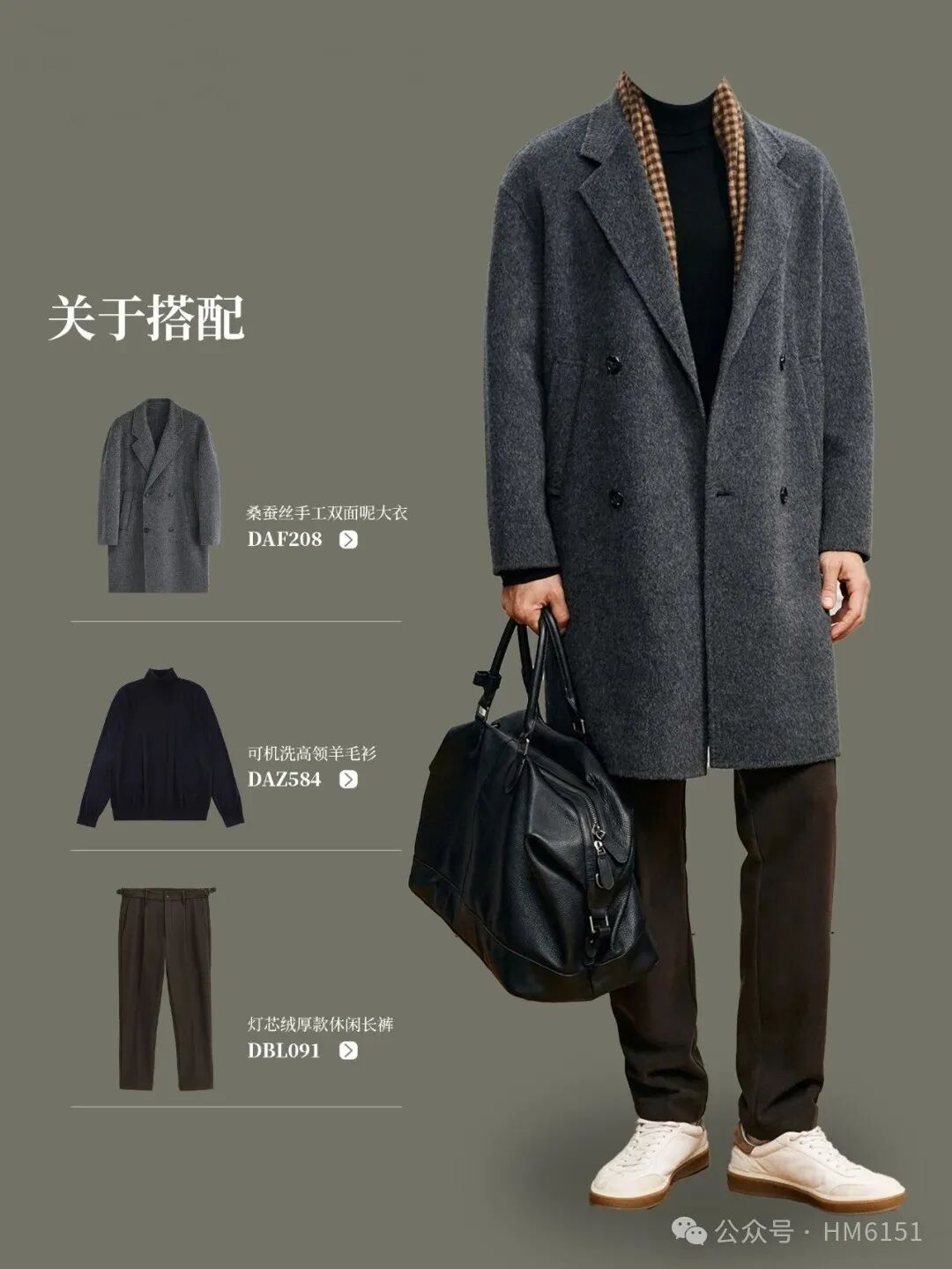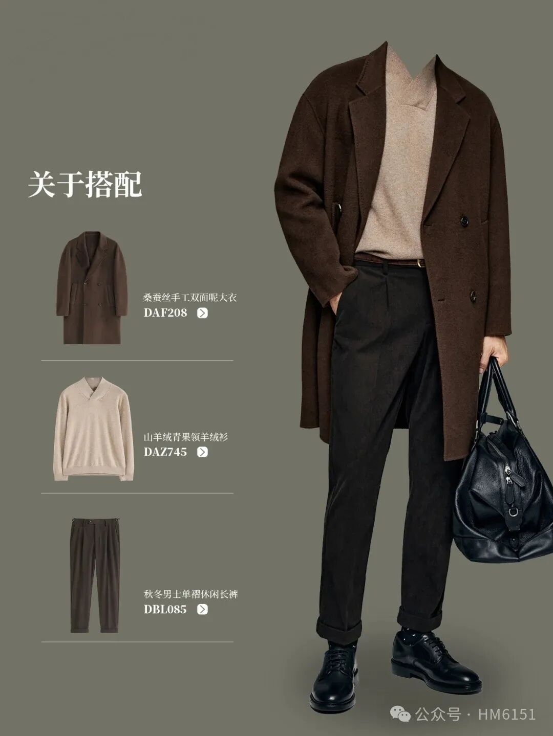 其经典的大翻领设计,不仅彰显出成熟男士的稳重与大气,还能在视觉上拉长身形,让人显得更加高挑。内搭卡其色青果领羊毛衫,温暖舒适的同时,增添了几分优雅与知性。单褶直筒休闲裤,修饰腿型,让整体造型更加流畅自然。黑色皮鞋与黑色休闲手提包的加入,更是为整体造型增添了几分精致与时尚感。中长款深灰色桑蚕丝手工双面呢大衣