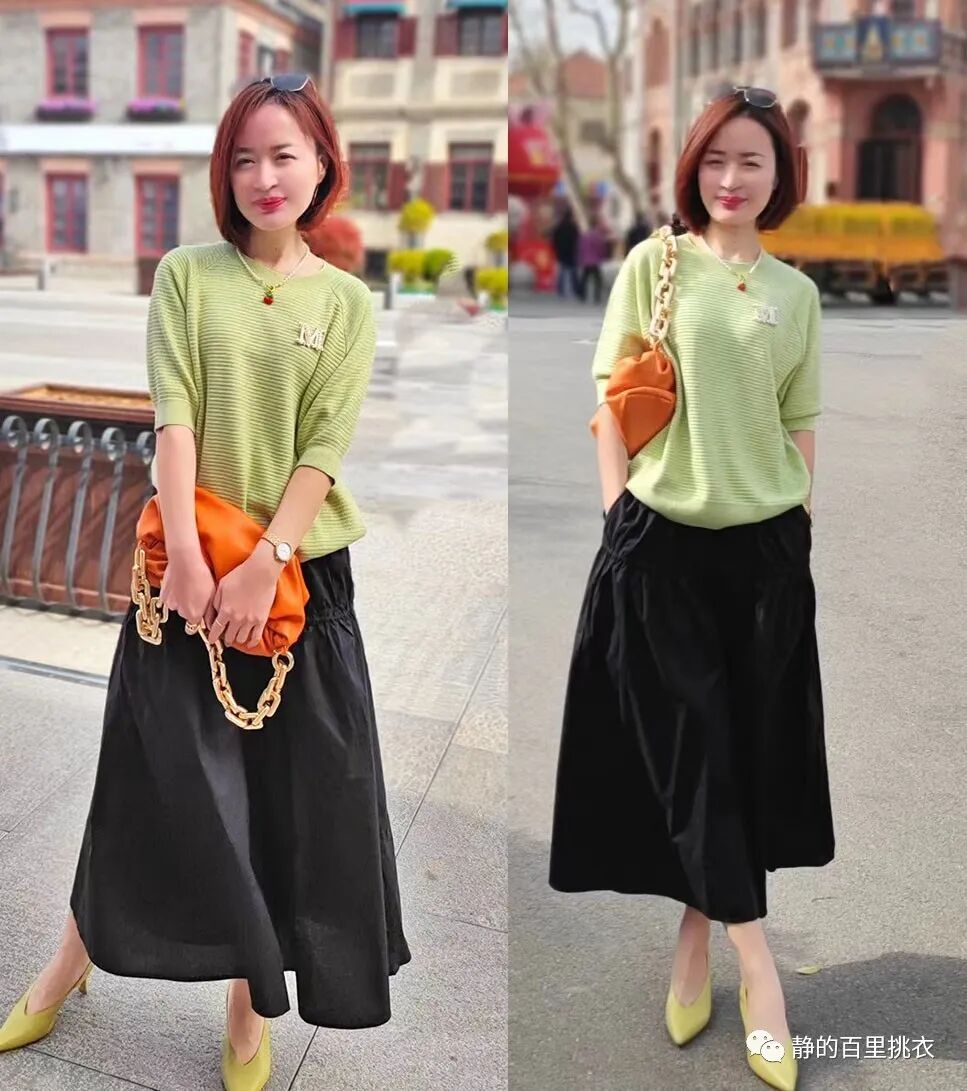 绿色针织T恤,在黑色的衬托下,格外能展现出清爽简约的一面,并对女性的年龄起到了优化作用,显得人更年轻。