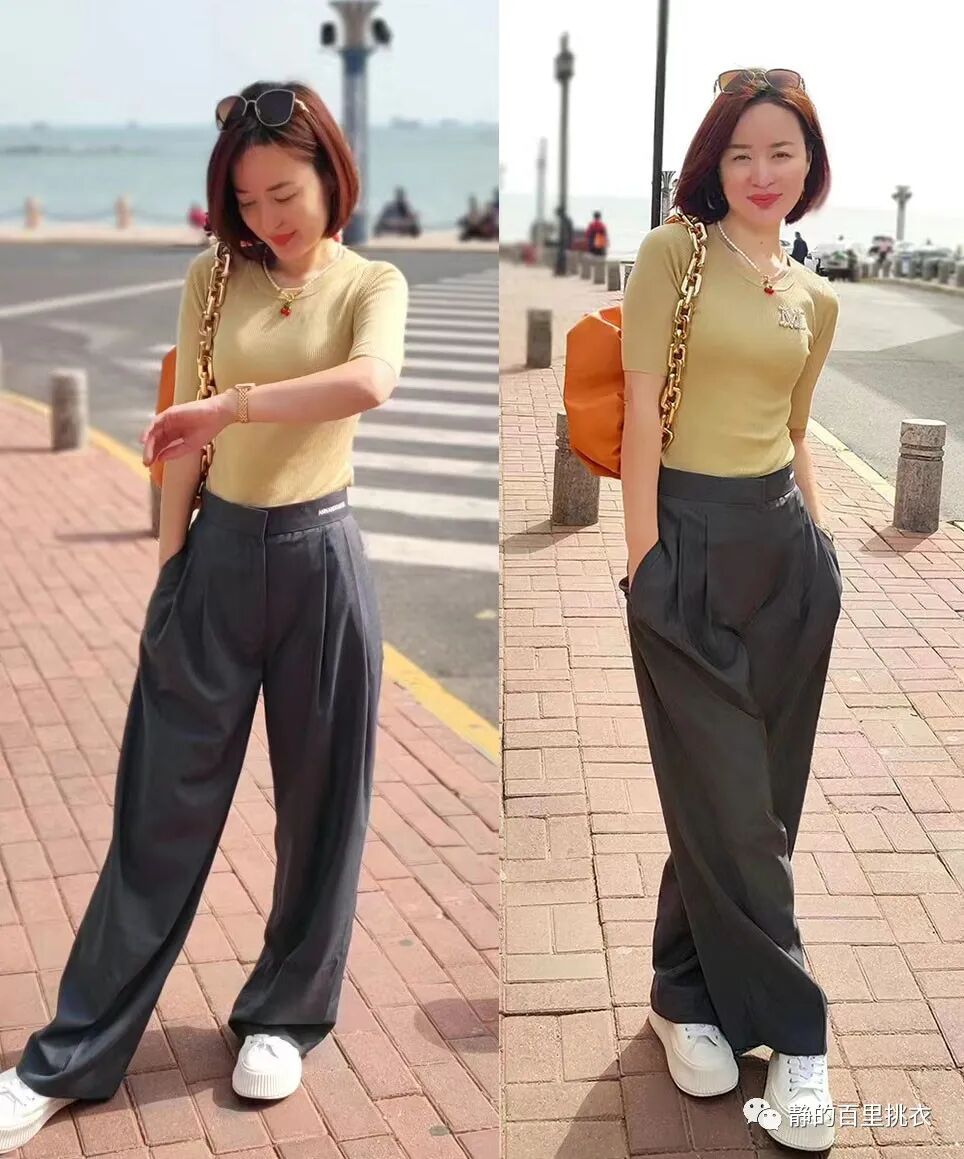 而采用阔腿裤搭配的话,则可以呈现出上窄下宽的感觉,完美演绎松弛慵懒的时尚态度。