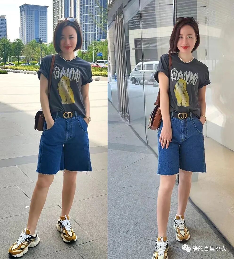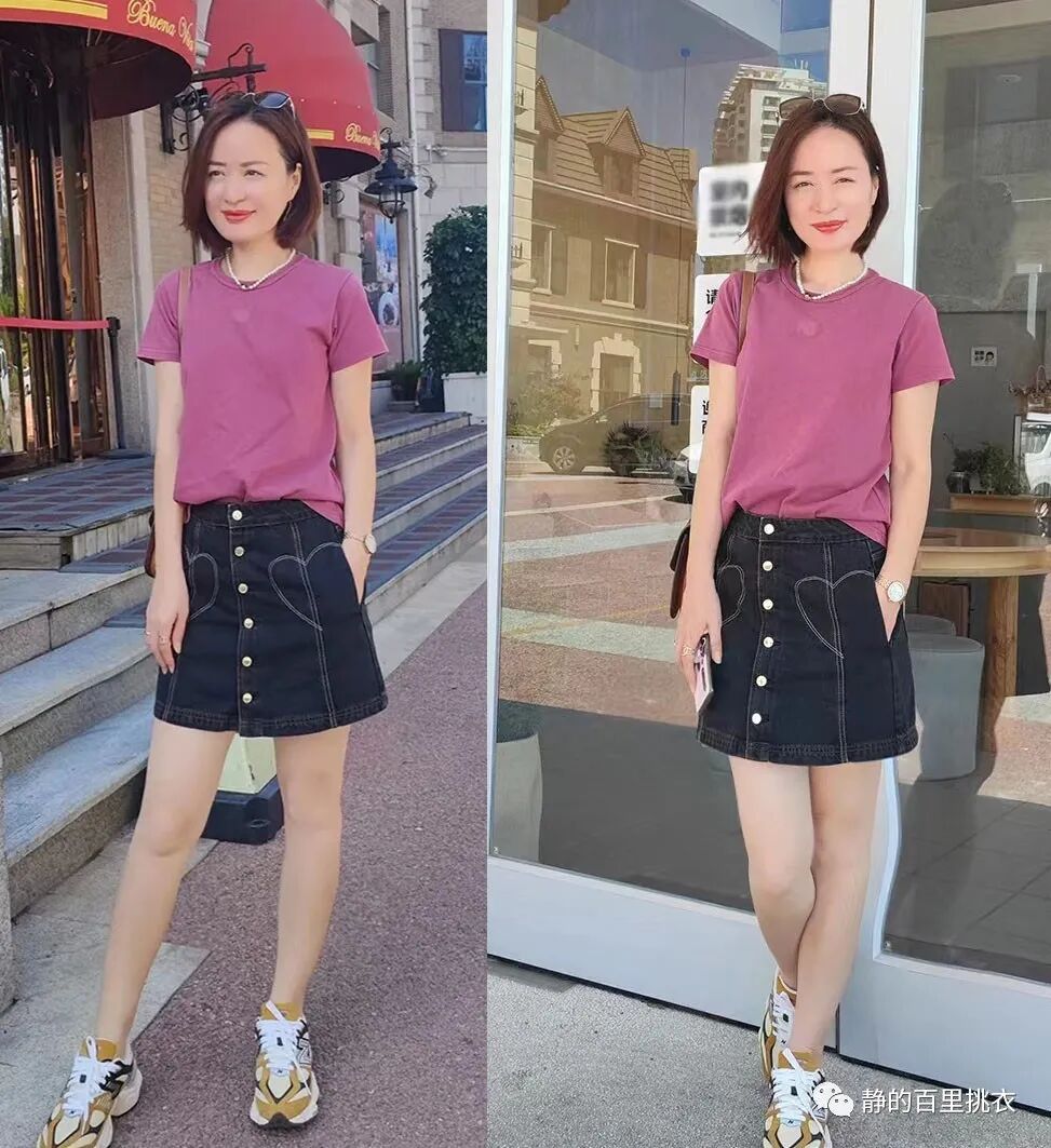 人到中年以后,有些女性的身材还可以保持得比较好,紧身T就可以直接采用,秀出优美的身材曲线。