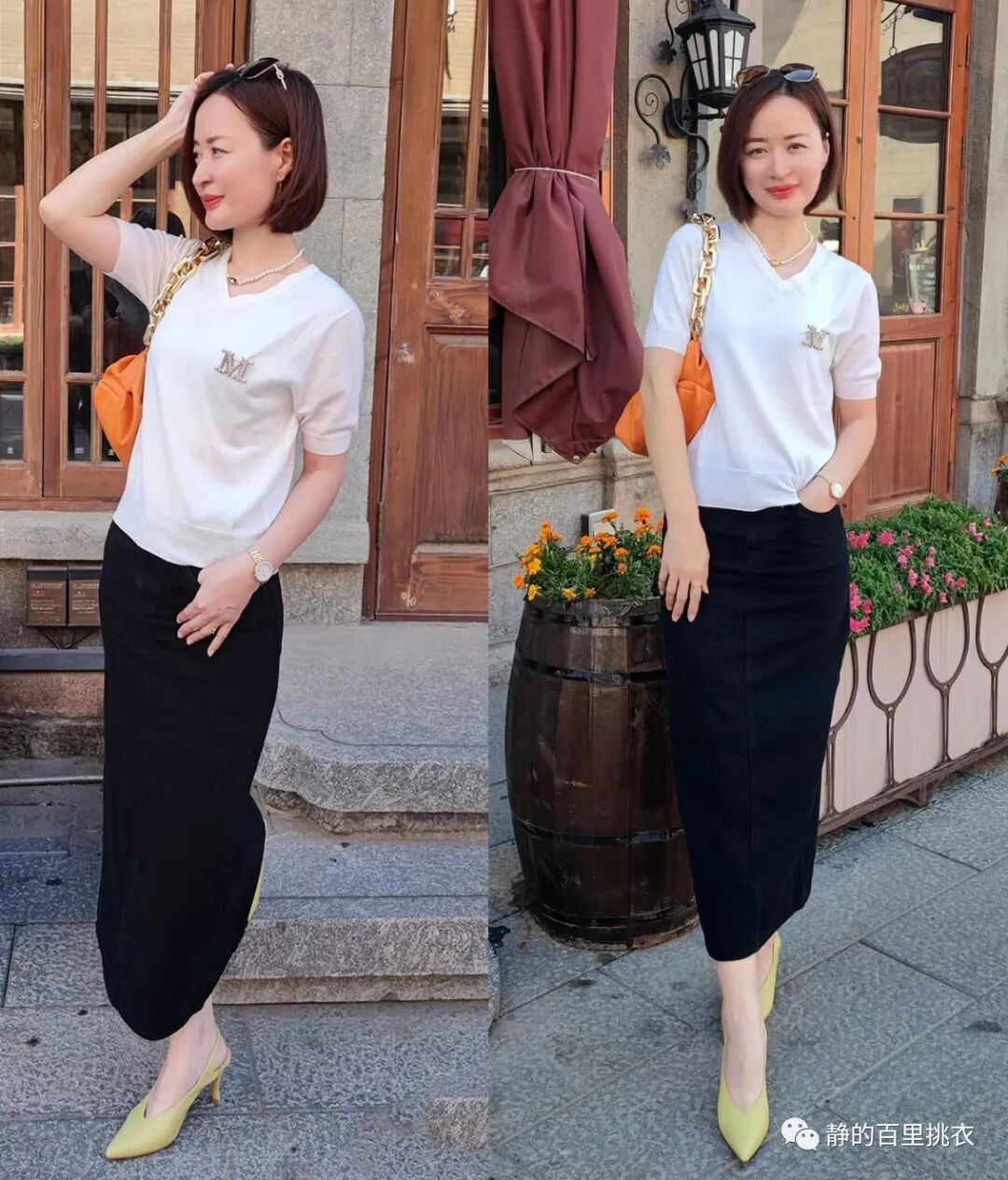 白色T恤与黑色半身裙的穿搭中,采用的就是浅黄色高跟鞋,因为造型中有同样清新风格的白色单品,看上去不会有突兀感,反而将优雅成熟的韵味表达的更加亮眼。